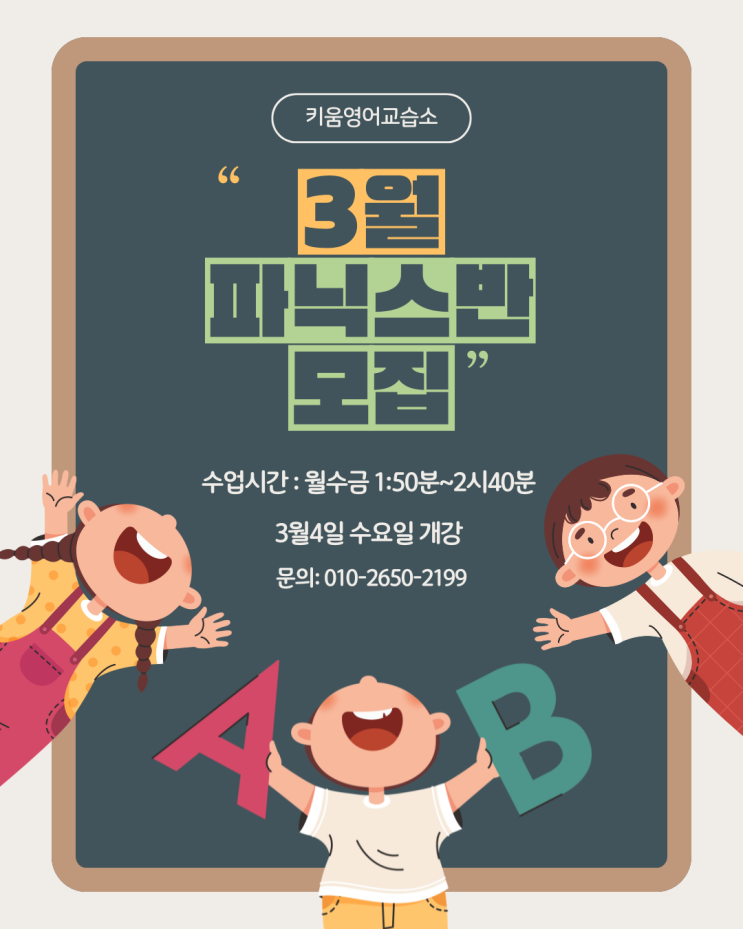 ✨ 2026년 3월, 신규 파닉스반 개강합니다! 영어의 시작은 파닉스입니다. 아이들이 영어를 어렵지 않고 즐겁게 시작할 수 있도록 2026년 3월, 신규 파닉스반을 개강합니다. 놀이처럼 즐기는 파닉스 수업 알파벳 소리부터 단모음·장모음까지 ✔️ 카드 놀이 ✔️ 게임 활동 ✔️ 말하고, 듣고, 써보는 반복 학습 단순 암기가 아닌, 아이들이 웃으면서 자연스럽게 익히는 파닉스 수업입니다. 꼼꼼한 학생 관리 ✔️ 아이별 이해도 체크 ✔️ 수업 중·후 학습 상태 지속 관리 “따라오지 못하면 그냥 넘어가는 수업”이 아닙니다. 아이 한 명 한 명 확실히 이해하고 넘어갈 수 있도록 지도합니다. 현재 대기자 있는 반입니다 이....... <img src="https://blogthumb.pstatic.net/MjAyNjAxMjFfODYg/MDAxNzY4OTY5NzA2MDc3.CoAUVL4cGNIgZ2dEJgKfdX2BernK86WyLtYI1jmptDUg.7OhYKLXFvZKa8jtEhV0o3m5sYcTN0ko6zfN_Gv0VzcMg.PNG/%C5%B0%BF%F2%BF%B5%BE%EE%B1%B3%BD%C0%BC%D2.png?type=s3" />