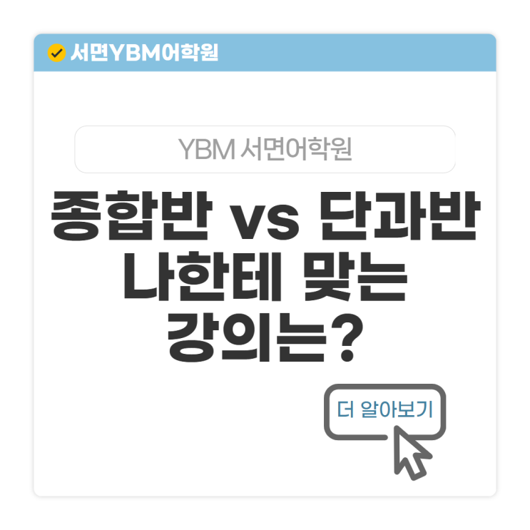 안녕하세요! YBM서면입니다 4월은 새로운 목표를 세우고 토익 공부를 시작하시는 분들이 특히 많은 시기인데요, 토익은 수업 선택에 따라 학습 방향과 점수 상승 속도가 달라지기 때문에 처음 반 선택이 정말 중요합니다! 토익 공부를 시작하려고 마음 먹으면 종합반을 수강해야할지, 단과반으로 수강해야할지 고민되실텐데요! 오늘은 종합반vs단과반 차이점을 정리하고, 어떤 분들께 각각 더 잘 맞을지 알려드릴게요 토익 종합반 (LC+RC) 종합반 (LC+RC) Listening 듣기 파트와 Reading 독해 파트를 한번에 배우는 수업 특징 ✔️ 전 영역 균형있게 학습 ✔️ 체계적인 커리큘럼 ✔️ 전체 점수 상승에 효과적 이런 분....... <img src="https://blogthumb.pstatic.net/MjAyNjA0MDFfMTY2/MDAxNzc1MDI1NTU4ODYx.AOzcBDmB_UZgL-xrLFDubV9h4cHdqgs9wiFvAGWDgEcg.SeFbgoa4O9l8y-lFyilJFtFtWGpWOYUr7PtqLp4tLJ0g.PNG/%BA%ED%B7%CE%B1%D7_%B4%EB%C7%A5%BB%E7%C1%F8%BF%EB_%2815%29.png?type=s3" />