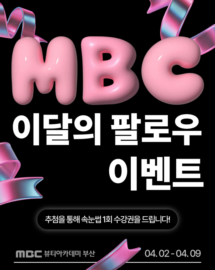 지금 팔로우하고 속눈썹 수강권 받아갈 기회까지! 속눈썹 펌 or 연장 1회 수강권 GET 참여방법 1️⃣ @mbcbeauty_busan 팔로우 2️⃣ 댓글에 친구태그 + 참여완료 남기기 (많이 태그할수록 당첨확률 UP) 이벤트 기간 04.02 ~ 04.09 당첨자 혜택 속눈썹(펌 or 연장) 1회 수강권 증정 놓치면 아까운 기회니까 지금 바로 참여하세요 MBC뷰티아카데미 부산 찾아오시는 길 http://pf.kakao.com/_hxciBxd/chat 위치: 중앙대로 707 문용빌딩 4층, 5층 상담 문의: 051-804-4777 Instagram: https://www.instagram.com/mbc_busan/ 카카오톡 상담 바로가기: http://pf.kakao.com/_hxciBxd/chat <img src="https://blogthumb.pstatic.net/MjAyNjA0MDJfMjM5/MDAxNzc1MTEyOTMxMTk0.FYfY2OZh01fkdW4euuvoJPMiCmbS-SZyR47DTRS3zQwg.EgKER5H_Rvn9KQooW0HlYiDtJaUxpsvpmjx0Fz0t27Yg.PNG/1.png?type=s3" />