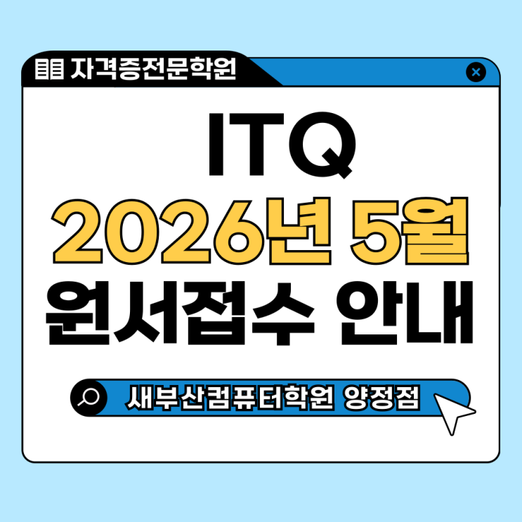 새부산컴퓨터학원 양정점 ITQ(정보기술자격) 2026년 5월 시험 원서접수 안내 안녕하세요 새컴지기입니다 부산 ITQ 컴퓨터학원 새부산컴퓨터학원 양정점에서 안내드립니다 총 2회 자격시험이 시행되는 5월, 제5회 ITQ정기시험과 제 14회 특별시험 일정 확인 후 시험 준비해 볼까요? 2026년 제5회 ITQ 정기시험 접수 및 세부 일정 & 비용 안내 2026년 제14회 ITQ 특별시험 접수 및 세부 일정 & 비용 안내 ITQ 자격시험은 단순 자격증이 아니라 실제로 사용할 수 있는 능력을 평가하는 시험입니다 ✔️ 한글은 문서 작성 능력 ✔️ 엑셀은 데이터 정리 및 분석 ✔️ 파워포인트는 발표 자료 제작 즉, 실무에서 바로 쓰는 능력을 자격증....... <img src="https://blogthumb.pstatic.net/MjAyNjAzMzBfMTAz/MDAxNzc0ODQ0NDg0NTA2.eL5u8rfpKs8W5PLfQcS5xjB4A7YLRWDnRxpVZJsZgBQg.xuoq7XRAazw-11WBvSUL_9IMacvGi0Yi1iFTnWyfQ4Qg.PNG/001.png?type=s3" />