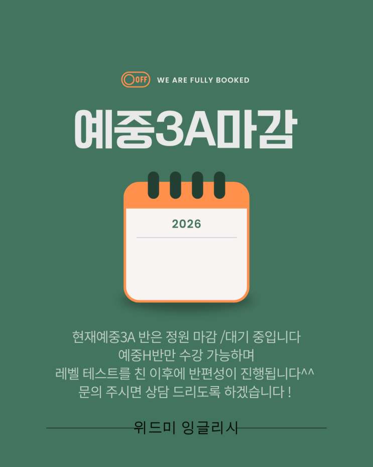 안녕하세요 ^^ 부산 양정에 위치한 초중고 전문 영어 학원 위드미 잉글리시 입니다 ^^ 학생들도 부모님들도 새학기 준비로 많이 바쁜 2월입니다 ^^ 신규 상담이 많았던 위드미는 이제 티오가 남은 클래스가 많지 않습니다 그 중에 문의가 많은 예중3학년 수업 마감부터 먼저 안내드리겠습니다. 위드미 잉글리시는 소수정예 최대 인원 6인으로 1인 원장 직강으로 수업이 진행되고 있습니다. 현재 예중2와 예중3은 분반 수업으로 진행되고 있으며 예중3A반은 정원 마감 / 대기중입니다. 예중3H반은 입회 가능하나 모든 반편성은 레벨 테스트를 기준으로 진행합니다. 레벨 테스트나 상담을 원하시는 분들은 위 네이버 톡톡으로 미리 예약주시면 레벨....... <img src="https://blogthumb.pstatic.net/MjAyNjAyMDdfMjgx/MDAxNzcwNDUwOTIwNjMy.EOcqEwWA2hV6aqPXf2A0K61SW3QOX-ZZUzltUdSKCF8g.PuvUy5AoSsrD4rFWxzGxyxnDdXe_um8pK-dPZLesvfcg.PNG/%C3%CA%B7%CF%BB%F6%B0%FA_%C1%D6%C8%B2%BB%F6_%B4%DE%B7%C2_%C0%CF%B7%AF%BD%BA%C6%AE_%B9%CC%B4%CF%B8%D6%C7%D1_%C6%E6%BC%C7_%C8%A3%C5%DA_%BC%F7%B9%DA_%BF%B9%BE%E0_%B8%B6%B0%A8_%B0%F8%C1%F6_%BE%C8%B3%BB_%C0%CE%BD%BA%C5%B8%B1%D7%B7%A5_%C6%F7%BD%BA%C6%AE.png?type=s3" />