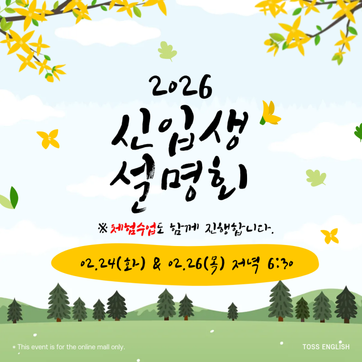 안녕하세요? 토스 잉글리쉬 입니다. 곧 있으면 3월 새학기가 시작되는데요. 토스에서도 3월 신입생들을 맞이하기 위해 준비하고 있어요:) 바로...! 신입생을 위한 설명회와 체험수업입니다 ■ 일시 : 2026. 02. 24(화) & 02. 26(목) 저녁 6:30 ■ 장소 : 토스 잉글리쉬 4층 본 설명회를 통해 아이들이 즐겁게 배우며 기초를 탄탄하게 다질 수 있는 수업 방향과 수준에 맞춘 단계별 커리큘럼을 소개합니다. 또한 실제 수업과 같은 분위기를 느껴볼 수 있는 체험 수업을 통해 아이들이 학원을 자연스럽게 경험할 수 있는 시간을 마련하였습니다. 아이와 학부모님 모두가 편안하게 참여하실 수 있으니 많은 관심과 참여를 부탁드립니다♥ <img src="https://blogthumb.pstatic.net/MjAyNjAyMDlfMjgg/MDAxNzcwNjI1MzczOTQx.DaPcl37CSfBVPlfi5G-t6JV4kXGMWQf7NzQzabzwu2Ag.o51L-bkbKGgEx6bxnhn3clR1ZVo9aS4ozGiZxtoDzIcg.PNG/%BD%C5%C0%D4%BB%FD_%BC%B3%B8%ED%C8%B8.png?type=s3" />