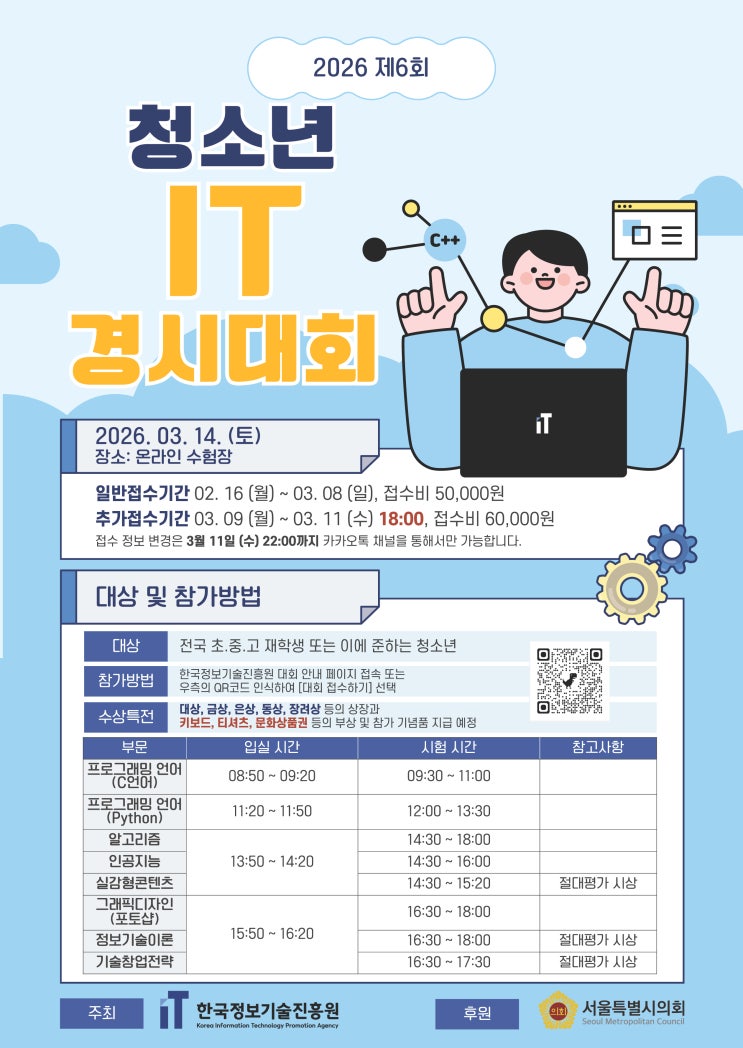 안녕하세요! 상상코딩학원 입니다. 2026 제6회 청소년 IT 경시대회가 개최됩니다!!! https://kitpa.org/contest/6 문의사항은 051-507-0756으로 전화주시거나 오픈채팅으로 편안하게 문의주세요! https://open.kakao.com/o/sfncKCVf <img src="https://blogthumb.pstatic.net/MjAyNjAyMTFfMTk5/MDAxNzcwNzgyNDU4NjE0.PRnsZcaXzCeArnUJTJAU5jLBWcHw4nkz17RQxbcNxD0g.ej78trg4ceK6K2HwWbmLJWLfvZuidtuwS8MZ1LLNREAg.JPEG/2026_%C1%A66%C8%B8_%C3%BB%BC%D2%B3%E2_IT%B0%E6%BD%C3%B4%EB%C8%B8_%C6%F7%BD%BA%C5%CD_%28260204%29.jpg?type=s3" />