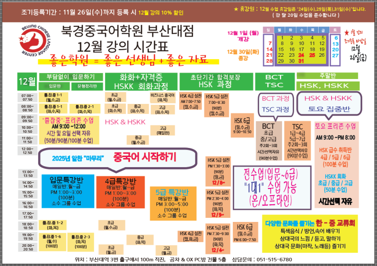 부산대점 12월 시간표 : 12월 1일(월) 개강 조기등록 : ~11월 26일(수)까지 할인 * 중국어 화상수업(ZOOM) 수업 12월 특강반 : 소수 그룹 수업 / 교차 수업 가능 / 조기등록 10% 할인 1. "왕초보" 특강반 : 틀을 잡아주는 중국어 : 월~금 PM 1:00~3:00 (100분 수업) 2. "4급 실전" 특강반 : : 월~금 PM 1:00~3:00 (100분 수업) 3. "5급 실전" 특강반 : : 월~금 PM 3:00~5:00 (100분 수업) 4. 주말 HSK 및 HSKK 회화반 : 토요 집중반 : AM 9:00~PM 8:00 : 시간 선택 자유 / 소수 그룹 수업 / 1:1 개인 수업 5. 기초회화 수업 : 틀을잡아주는중국어 입문/기초편 : 격일반 / 월수금 / 화목금 / 교차수업 가능 6. HSK ....... <img src="https://blogthumb.pstatic.net/MjAyNTExMjFfMjQg/MDAxNzYzNjkzNTE4Njc0.yjZEb9bIhlHd9SIsb9mnDLL8OiGdndCmTQJmpo2qpKQg.OLbGWUsR54iQbFUY_1VDPsD5xNiQxlxWysjM_0vP2HQg.PNG/12%BF%F9_%BD%C3%B0%A3%C7%A5.png?type=s3" />