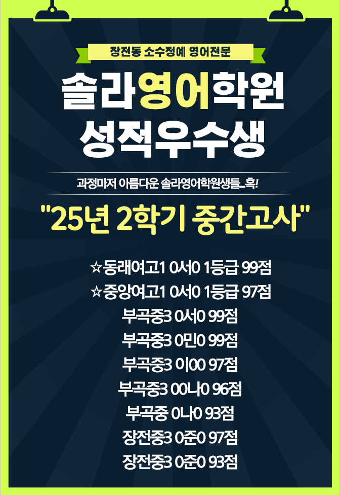 헬로 페어런츠! 오랜만에 블로그에 로그인을 했습니다. 2학기는 중3 시험 일정이 달라 몇달 째 계속 시험대비를 하고 있습니다..... (전국의 학원 선생님들 화이팅!) 여름방학을 열정적으로 보낸 우리 학생들의 실력이 드디어 시험에 반영되고 있네요! 뿌듯뿌듯 기특기특합니다. 노력에 비해 아직 결과가 만족스럽지 않은 학생들은 지금도 부들부들 열심열심 기말고사 대비를 하고 있구요. 학생들의 찬란한 20대를 위해서 도움이 되고자 하는 저를 비롯한 우리 솔라영어 선생님들의 마음을 우리 솔라학생들은 너무나 잘 알고있답니다. 웃음소리와 고함소리가 동시에 울려퍼지는 기말고사 시험기간, 오늘도 열심히 보내겠습니다. 그리고 다가오는....... <img src="https://blogthumb.pstatic.net/MjAyNTExMjZfMjMw/MDAxNzY0MTM5OTU3MjI3.SxAZBQPAgIYQekGd_506ss9NMy0HDQFljQuXHiu9RBUg.6BdjYhZcR7fQLkk_RLVdKHdj9gvzlZABvelcCGxNbQcg.PNG/%BC%BA%C0%FB%BF%EC%BC%F6%BB%FD8-001.png?type=s3" />