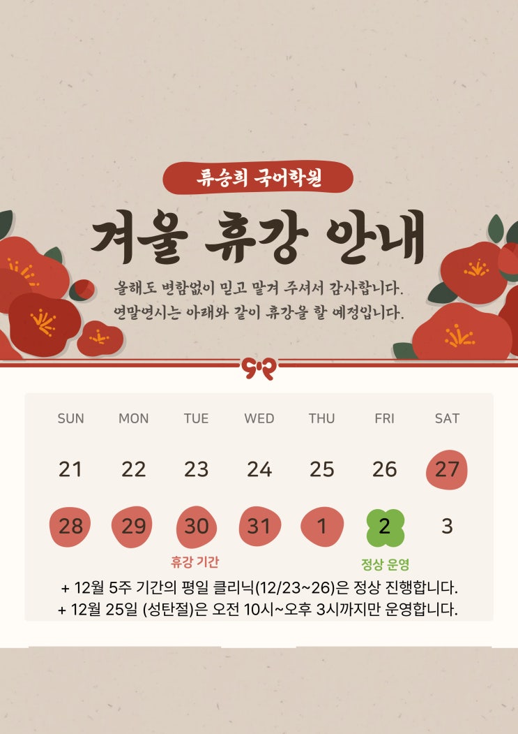 안녕하세요~^^ 겨울방학을 맞이한다는 것은 아이들이 한 해의 수업을 잘 마쳤다는 것을 의미하고 한편으로 학부모님의 한 해에 대한 노고가 결실을 맺었음을 의미하기도 합니다. 일년동안 상당히 노고가 많으셨으며, 감사드립니다. <img src="https://blogthumb.pstatic.net/MjAyNTEyMDJfMjI3/MDAxNzY0NjA0Mzk5NDMx.14MN3Uo7zKY-ktVk6eI0rDz0BiSkz_RiGfQKyFS5YC4g.fBtf3v1b-IytA1oFq1QghzjHt_BHoW69J-YrYB0g2cQg.PNG/%B0%DC%BF%EF%B9%E6%C7%D0_%BE%C8%B3%BB%B9%AE.png?type=s3" />