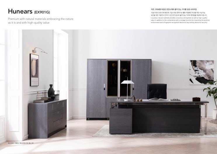 안녕하세요. 중역용 가구를 검토하시는 분들을 위해 주요 시리즈를 한 번에 정리했습니다. 해당 제품들은 모두 **주문 제작 방식**이며, **주문 후 약 14일 정도 제작 기간**이 소요됩니다. 공간 구성과 사양에 따라 일부 일정은 달라질 수 있습니다. ## Hunears (EX901G) 천연 소재와 전자 기능이 결합된 상위 라인입니다. * 건식 무늬목과 통가죽 상판 적용 * 스테인리스 프레임 구조 * 지문인식 및 RF 카드 인식 기능 * 하부 PC 수납 슬라이딩 구조 * 전동 높이 조절 회의 테이블 (앱 및 스위치 제어) 전체 공간을 하나의 시스템처럼 구성할 수 있는 것이 특징입니다. ## RESERVA 곡선 중심 디자인이 특징인 시리즈입니다. * 유선형 상판과 3다....... <img src="https://blogthumb.pstatic.net/MjAyNjAzMzBfMjc5/MDAxNzc0ODMyOTA0MTUy.X2yi7Xy7Rjedn5ELEPszfdXljiViCBlF_nFJYH4ZuI4g.1a9IlXFKUqSrQvg52s_dPpH9D8f4KA1ma8Qt0OMM7lYg.JPEG/%C1%DF%BF%AA%C3%A5%BB%F3_%281%29.jpg?type=s3" />