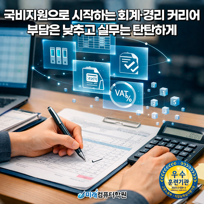 1. 국비지원으로 회계·경리 시작하기, 부담은 줄이고 실무는 탄탄하게 회계를 처음 배우는 입문자도 따라올 수 있게 구성된 과정이에요. 미래컴퓨터학원은 부산 국비지원학원으로 내일배움카드를 활용해 수강 부담을 줄이고, 회계·경리 실무에서 자주 쓰는 흐름을 기초부터 차근차근 잡아드립니다. 훈련장려금은 대상자에 한해 받을 수 있는 경우도 있어, 조건이 맞는 분들은 학습에 더 집중하기 좋아요. 2. 전산회계 1급, 회계 기초를 실무 기준으로 확실히 잡기 전산회계 1급 대비를 중심으로 회계의 기본 체력을 만들어요. 계정과목 이해,전표 처리, 정리의 흐름처럼 현장에서 꼭 필요한 기본을 반복 실습으로 익히면서, 시험 대비와 실무 적....... <img src="https://blogthumb.pstatic.net/MjAyNjAxMTJfMTEg/MDAxNzY4MTg1NzQxNjk5.A6R7OCV3_R387kZeqADEbrgk0g8zWrKItXnt-jw-RXsg.fXReM-VVgGL-1yUQizLzYN05sEyG2MKMIJxf-XJs-OIg.PNG/%BE%C6%C6%AE%BA%B8%B5%E5_1.png?type=s3" />