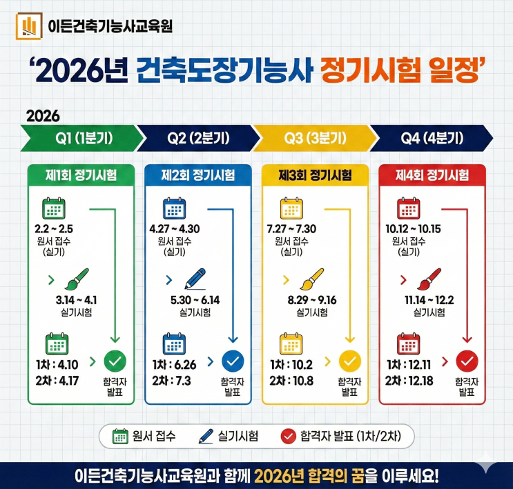 2026년 국가기술자격검정 일정이 나왔습니다. 자세한 일정은 아래 표를 참고하시면 됩니다. 저희 부산건축시공전문학원에서는 건축일반시공기능장, 건축일반시공산업기사 타일기능사, 미장기능사, 조적기능사, 온수온돌기능사 방수기능사, 건축도장기능사 교육을 진행하고 있습니다. 건축일반시공기능장 건축일반시공기능장 시험은 작년부터 매년 초에 진행하는 것으로 변경되었습니다. 저희 학원에서는 2022 ~ 2025년 4년 연속 건축일반시공기능장 합격자를 배출하였으며 2022년과 2024년에는 전국에서 합격자를 유일하게 배출한 학원입니다 시험이 이틀 안에 치뤄지기 때문에 미장+타일, 조적을 나누어서 연습을 많이 하셔야 하며 대부분 시간....... <img src="https://blogthumb.pstatic.net/MjAyNjAxMDlfODQg/MDAxNzY3OTIzNDUwOTYz.acv_0H5G1OeQDklJeGAjRAofB86kR7e71rX7TQEtdVYg.-F3iDYEGZi7C1UqREF15_Awrs7V5wDW7BzdZJJkRZE8g.JPEG/KakaoTalk_20230616_084002588.jpg?type=s3" />
