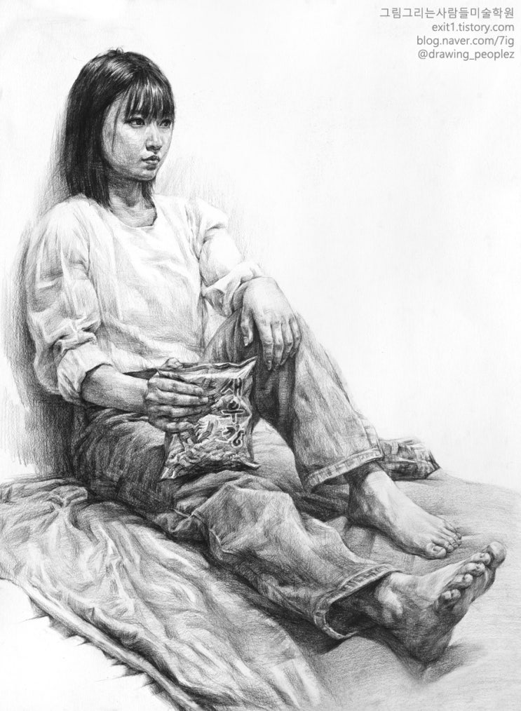 [인체소묘 / 학생작] 흰 블라우스, 청바지를 입고 과자봉지를 든 여성