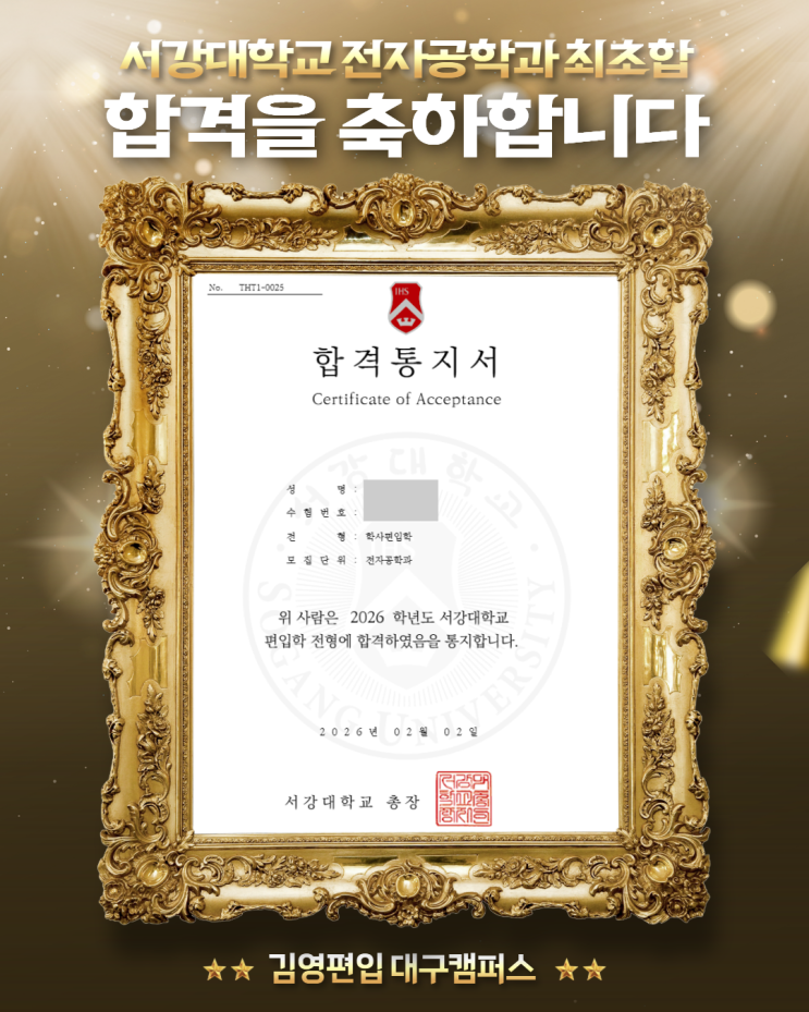 안녕하세요. 대구 경북 편입 학원 김영편입 대구캠퍼스 입니다. 오늘은 정말 기분 좋고 에너지 넘치는 소식을 가져 왔는데요! 서강대 전자공학과와 한양대 경영학부를 최초 합격했다는 엄청난 결과를 안고 작년 수강생이 깜짝 방문해주었습니다! 무려 문·이과 교차 지원까지 완벽하게 성공한 능력자라는~! 서강대 전자공학과 최초합격도 모자라 교차 지원한 한양대 경영학부 까지!! 교차지원으로 문과와 이과 꿈의라인을 합격해버린 대단한 학생이 마침 간담회 날 서프라이즈 방문이라니! 그래서 모셨습니다. 두 둥 ! 담임 선생님이셨던 부원장님께서 직접 소개를 해주시며 합격생 간담회를 시작했습니다! 합격의 기운을 가득 담아 후배들을 위해....... <img src="https://blogthumb.pstatic.net/MjAyNjAyMTJfMjcg/MDAxNzcwODYzNzM5NDY5.2ZFLMulIKx6lFm3lf2daMQcOdrQ2S0auSgtX56lY1p8g.H4HhER3XnhcuubStgRbDLvwSjrDpOpzvzna_56fSGuMg.PNG/%C1%A6%B8%F1%C0%BB_%C0%D4%B7%C2%C7%CF%BC%BC%BF%E4_%2820%29.png?type=s3" />