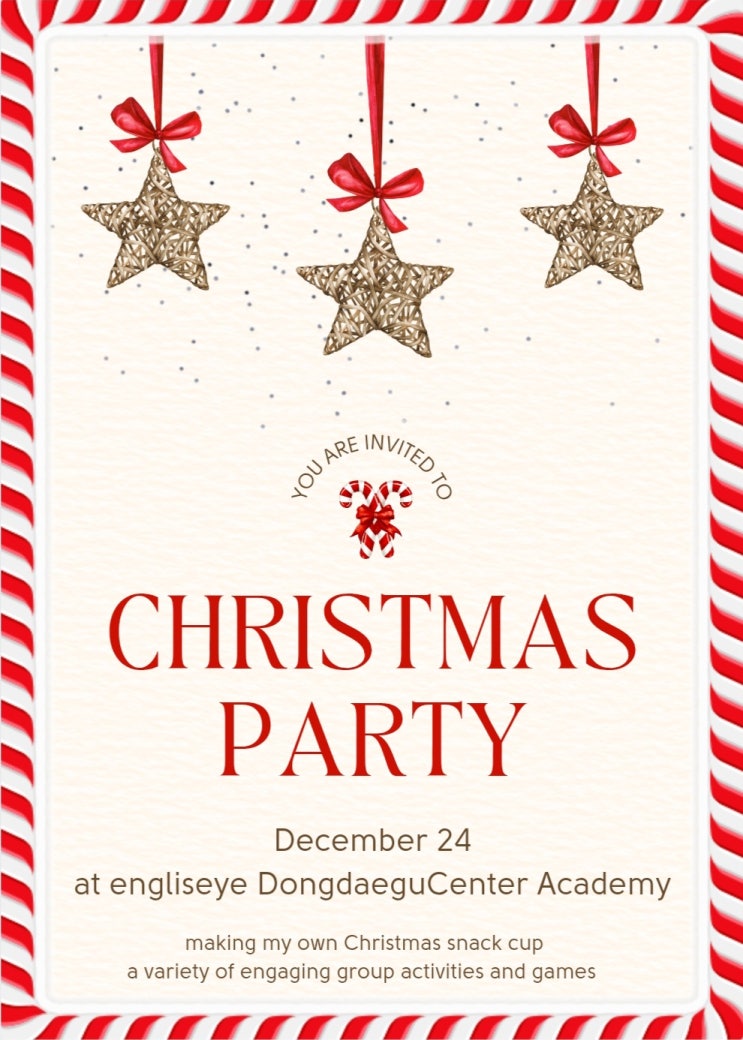 안녕하세요 :) 따뜻한 배움이 있는 곳, 여기는 잉글리시아이 동대구센터점 영어학원입니다✨ 새로운 한 해를 시작하며 아이들과 함께했던 작년 크리스마스의 소중한 순간을 돌아보려 해요 이번 크리스마스 파티는 아이들이 더 적극적으로 참여하고, 서로 협동하는 경험을 할 수 있도록 팀으로 나누어 다양한 활동을 진행했어요 먼저, [ ☕ 크리스마스 시리얼 컵 만들기 ] 각자 컵에 크리스마스에 맞는 그림을 그리고, 그 안을 시리얼로 가득 채우며 크리스마스 분위기를 한껏 느껴봤어요 그 다음은 [⚡Word Speed Game ] 설명을 포함해 모든 과정이 영어로 진행된 게임으로 영어 감각을 한껏 끌어올릴 수 있는 시간이었어....... <img src="https://blogthumb.pstatic.net/MjAyNjAxMTJfMjIg/MDAxNzY4MTg2NjQzMjA4.TLSEoRTqV7M5l2HCFHjzDqbhi7WJkaQfi64HkcsWVHYg.bFquyNZwha4zjCIaly6BQA4R0qvfpOb8g6rx1lhgdBYg.JPEG/%C5%A9%B8%AE%BD%BA%B8%B6%BD%BA_%C7%A5%C1%F6.jpg?type=s3" />