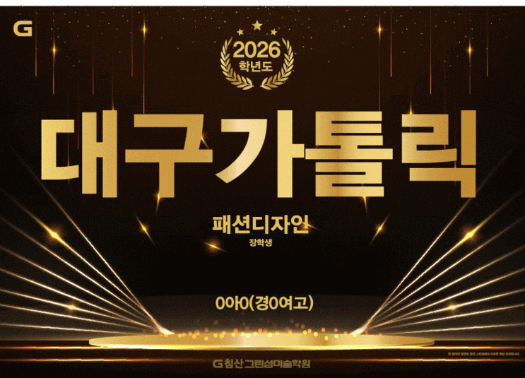 2026학년도 대구가톨릭대학교 수시전형 합격자 ----------------------- 안녕하세요. 대구 침산 그린섬미술학원입니다. 이제 수시가 거의 끝이 나고 수시결과가 발표가 나기 시작했습니다. 열심히 한 만큼 좋은 결과가 나올거라 생각합니다. -------------------- 대구가톨릭대학교 수시 합격자입니다. 대구가톨릭대학교 수시전형 1명 지원 1명합격!! 장학생 합격!! 합격을 축하합니다. 합격을 축하합니다. --------------------------- 대구미술학원 대구북구미술학원 가까운 곳에서 안전하게 ~ 지원자 대비 최고의 합격결과~ <img src="https://blogthumb.pstatic.net/MjAyNTExMTVfNzYg/MDAxNzYzMTgxNjM1NzQ3.DRW0vIoBgilvg-bqwJT8E2488TMMu06jR75A7XrquBEg.M22IyucNN43RbmYs9YsCeBkKGWQDqNgn4cm8s6uG_hgg.GIF/%B4%EB%B0%A1%B4%EB_%BA%B9%BB%E7.gif?type=s3" />