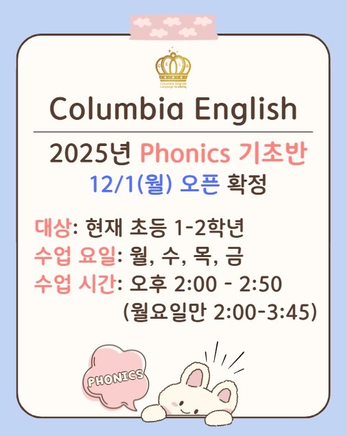 안녕하세요. 즐겁게, 제대로, 꼼꼼히! 대구 연경동 프리미엄 영어 로드맵! 컬럼비아 영어학원입니다. 오랜만에 신규 반 오픈 소식 안내드립니다. 2025년 Phonics 파닉스 기초반 12월 오픈 확정! 대상: 현재 초등 1-2학년 수업 요일: 월, 수, 목, 금 수업 시간: 오후 2:00 - 2:50 월요일만 2교시 수업으로 (오후 2:00 - 3:45분 수업) 저희 컬럼비아 영어학원은 매년 수능일 이후, 12월에 모든 학년이 1개 학년씩 진급을 하며, 다음 학년/학기를 준비하고 있습니다. e.g.) 매년 12월에 1개 학년 진급 초등 1학년-> 초등 2학년 초등 6학년 -> 중등부 (중1) 진급 중등 3학년 -> 고등부 (고1) 진급 그래서 12월 이후에 시간표에 여유가....... <img src="https://blogthumb.pstatic.net/MjAyNTExMjFfMjI3/MDAxNzYzNjg4OTcwNjE2.BMfKuIwr2RWgmcsZAzPWcvBq_LQACz2syh5AvHDTdvYg.evFTUmDVieaTTthPkaUHFIrm3AtbGcN6_yhtG7NuqH0g.JPEG/41F70867%A3%AD25E5%A3%AD44FC%A3%ADBF77%A3%ADCDBAB6B69189.jpg?type=s3" />