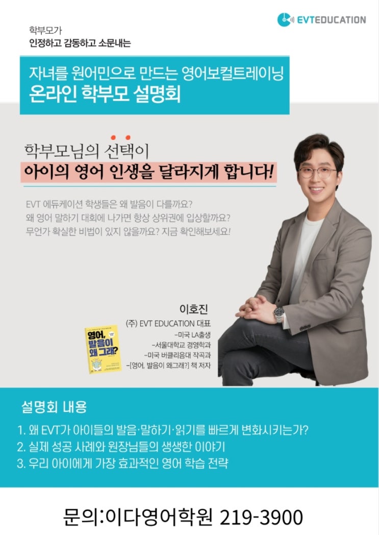 이다영어학원 EVT영어보컬트레이닝 온라인 학부모 설명회 우리 자녀의 영어 어떻게 시작해야 할지 고민 많으시죠? 아이의 영어 실력을 확실하게 변화시키고 싶은 학부모님을 위해 특별한 시간을 준비했습니다. 왜 EVT가 아이들의 발음 말하기 읽기를 빠르게 변화시키는가? 실제 성공사례와 원장님들의 생생한 이야기 등 김호진 대표님이 직접 전달해 주시는 온라인 학부모 설명회를 12월 17일(수) 저녁 8시에 만나보세요. 온라인 학부모 설명회 참석을 원하시는 기존 학부모님들께서는 카톡으로 참석 남겨주시고 기존 학부모님이 아니시라면 블로그 댓글에 비밀댓글로 연락처 남겨주시면 링크 보내드리겠습니다. 그 밖의 궁금하신 점은 문의하시....... <img src="https://blogthumb.pstatic.net/MjAyNTEyMTBfMTA0/MDAxNzY1MzMxMTgzNzcy.NqWYIc_zbufyhEHZkPbKCTGzuXCqkhRAM_CStMaENPEg.Rodk_ewRmkMmIVg0p1qlOaLoO2nGQ0S1VS-73tW0A00g.JPEG/900%A3%DF1765331168735.jpg?type=s3" />