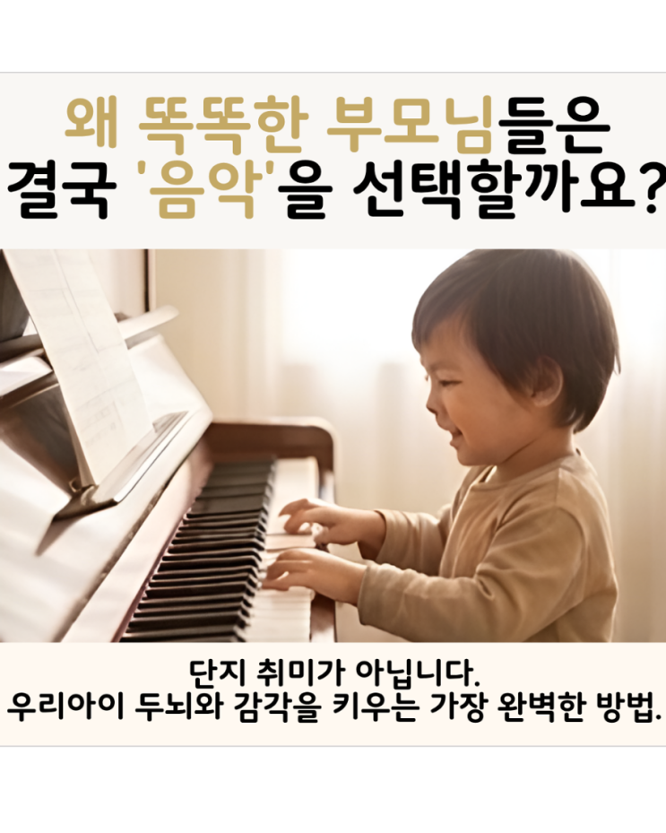 안녕하세요, 학정동 피아노스토리 음악학원입니다. 요즘 우리 아이들, 영어에 수학에 참 배울 게 많죠? 그런데 교육에 관심 좀 있다 하시는 '똑똑한 부모님들'이 끝까지 놓지 않는 한 가지가 바로 '음악'입니다. 단순히 취미를 넘어서, 음악이 우리 아이의 미래를 바꾸는 가장 완벽한 밑거름이 되기 때문이죠. 배움은 곧 '뇌의 성장'입니다. 새로운 악보를 보고 손가락을 움직일 때, 우리 아이의 뇌는 그 어느 때보다 활발하게 움직입니다. 특히 악기 연주는 좌뇌와 우뇌를 동시에 자극하는 최고의 '두뇌 트레이닝'이에요. 어릴 때 형성된 이 뇌의 회로가 평생의 사고력을 결정합니다. 멀티태스킹....... <img src="https://blogthumb.pstatic.net/MjAyNjAzMTBfMTA3/MDAxNzczMTEwOTI5NTI5.DcPD1YAQhnAnpvm3dGW0x2zB8bwwxhdJXvs1f_YIQwEg.flL2Jx5zD8WTFAN2IzhESoocb0W6Z-m7tvNFmbANR58g.PNG/900%A3%DFIMG%A3%DF20260309%A3%DF115125%A3%DF%A3%A81080%A3%DFx%A3%DF1350%A3%DF%C7%C8%BC%BF%A3%A9.png?type=s3" />