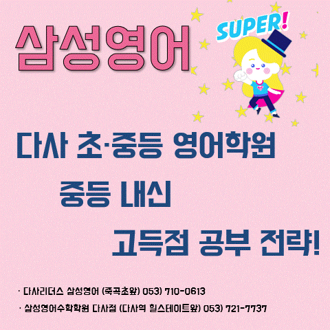 안녕하세요 삼성영어학원 다사리더스교실(대실역) 삼성영어수학학원 다사점(다사역) 입니다~ 중등 영어에서 성적이 갈리는 이유는 ‘공부 시간’이 아니라 ‘공부 방식’에 있습니다. 시험 직전에 몰아서 외우는 공부, 문제만 반복해서 푸는 공부로는 상위권을 유지하기 어렵습니다. 중등 시기는 고등 내신과 수능의 기초를 다지는 가장 중요한 시기이기 때문입니다. 그렇다면 지금, 우리 아이의 공부 방법은 제대로 가고 있을까요? ✅ 고득점을 만드는 영어 실력의 조건 좋은 성적은 ‘운’이 아니라 ‘기초 체력’에서 나옵니다. ✔ 단어의 정확한 쓰임 이해 ✔ 핵심 문법의 개념 + 실제 적용 능력 ✔ 문장 구조를 읽어내는 힘 ✔ 글 전체....... <img src="https://blogthumb.pstatic.net/MjAyNjAyMTFfMTU1/MDAxNzcwNzkyMzM0MDIz.NQu0v-247RN9lgEXlLV6O-_sEU5FoyWNMSwNHkUsmGgg.qVn_JCDHfDt7ry630jGUyYut9hvVtXir8n0CyqbjUiUg.GIF/%B4%D9%BB%E7_%C3%CA%26middot%3B%C1%DF%B5%EE_%BF%B5%BE%EE%C7%D0%BF%F8_%A6%A2_%C1%DF%B5%EE_%B3%BB%BD%C5_%B0%ED%B5%E6%C1%A1_%B0%F8%BA%CE_%C0%FC%B7%AB.gif?type=s3" />