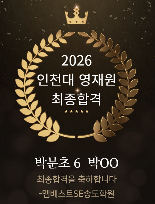 송도에서 수학학원과 사고력학원을 찾는 학부모님들은 대부분 영재원 준비까지 한 번에 해결할 수 있는 곳을 원하시죠. 이번 인천대 영재원 최종 합격 소식은 엠베스트SE송도학원의 탄탄한 커리큘럼과 학생 맞춤 시스템이 얼마나 효과적인지 다시 한번 증명해 주는 결과였어요. ⸻ ⭐ 2026 인천대 영재원 최종 합격 이번에 송일초 4학년 문00 학생과 박문초 6학년 박00 학생이 인천대 영재원 최종 합격이라는 큰 성과를 이루었습니다. 두 학생의 성장 과정을 보면서 영재원 준비는 단순한 문제풀이를 넘어서, 개념·사고력·면접 대비까지 모두 균형 있게 이루어져야 한다는 걸 다시 확인할 수 있었어요. ⸻ 송일초 4학년 문00 학생 “대형 수....... <img src="https://blogthumb.pstatic.net/MjAyNTExMTlfMjkx/MDAxNzYzNTI3OTUzMjcx.pBDhkA7M8xJlrrP3TchyA3iM6ofMxc4bW6OqY_t9sXUg.E3rmld3YyHcj3T1P_pwodVCGSYTU7WS3PSF99mfrYyAg.PNG/2.png?type=s3" />