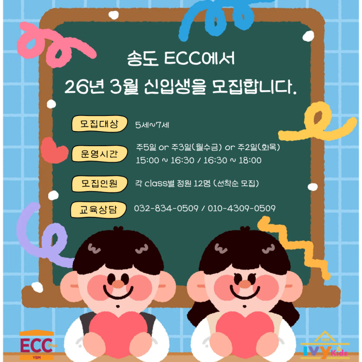 송도 ECC 26년 3월 신입생을 모집합니다! 대상은 5세~7세 초등1학년~2학년 입니다 :) 상담이 필요하신 학부모님들께서는 학원으로 전화 주시면 상담 도와드리겠습니다! <img src="https://blogthumb.pstatic.net/MjAyNTEyMDVfMjI5/MDAxNzY0OTI0OTI5MzIz.pw28Cr54kK9TallfVuspGa-xCo8qVtCq_09nENs8fbMg.BFut7HipOqg4diZFFtaEvbaKBCNowVQ_dx4EOQcLLW4g.PNG/26%B3%E23%BF%F9%BD%C5%C0%D4%BB%FD%B8%F0%C1%FD57%BC%BC.png?type=s3" />