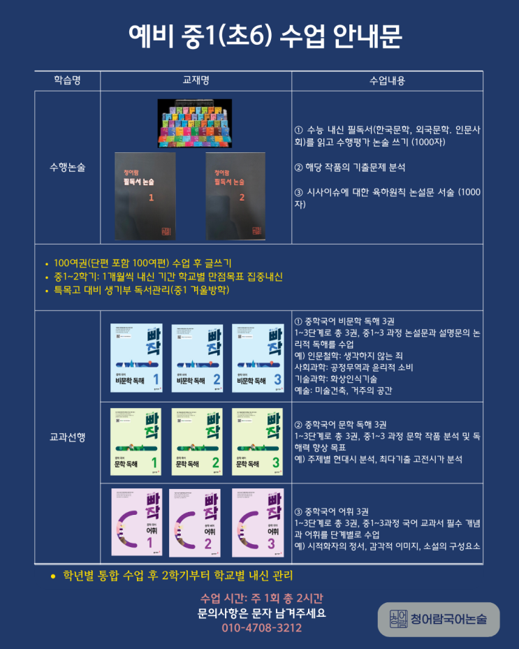 안녕하세요. 송도 국어논술전문학원 청어람국어논술입니다. 예비 중1 수업 안내문입니다. 방문상담은 예약제이오니 미리 문자 주시기 바랍니다. 상담문의는 아래 번호로 문자 주세요. (학년, 학교 기재 필수) ☎010-4708-3212 <img src="https://blogthumb.pstatic.net/MjAyNTEyMDZfMjAy/MDAxNzY1MDA0Mzc5MjE0.ONdHurA9-_KYVLaU6Vth0PWsywWrq4mOYYf818PtN30g.FicZ0KHeuYGkn1oyjz37XaCzXc6JHkFpNZoJVv7y1pwg.PNG/%BF%B9%BA%F1_%C1%DF1_%BE%C8%B3%BB%B9%AE3.png?type=s3" />