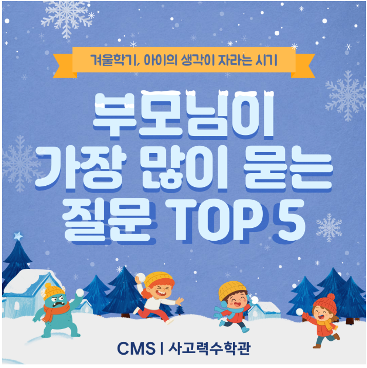 안녕하세요, CMS 송도사고력수학관입니다 어느덧 12월이 시작되고, 겨울학기가 시작되었니다. 새 학기를 준비하면서 많은 학부모님들께서 상담을 통해 공통적으로 주시는 질문들이 있어 오늘은 그 내용을 한 번 정리해보았습니다. 겨울은 멈추는 시기가 아니라, 아이의 성장이 가장 크게 일어나는 기회입니다. 아래 질문들이 학습 방향 설정에 작은 힌트가 되기를 바랍니다. ❓ Q1. 사고력 수학, 언제부터 시작하는 게 좋을까요? 사고력 수학은 문제 풀이 훈련이 아니라 ‘생각의 기초를 세우는 과정’입니다. 정답을 맞히는 연습이 아니라, 왜 그런지 스스로 질문하고 설명할 수 있는 힘을 기르는 단계입니다. 특히 6–9세 시기는 두뇌의 전....... <img src="https://blogthumb.pstatic.net/MjAyNTEyMDFfMTcw/MDAxNzY0NTYyOTI0Njcz.qx4eixE0O1N8btEl48iIG60TBTEhkhlshjFY3LyL-hsg.v0BU4-qaICRmkSoYWe3SnGzgx4Msix_uaZoPqxlLM8Ug.PNG/image.png?type=s3" />