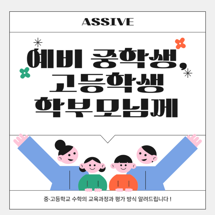 안녕하세요, 송도 어시브수학학원입니다 새로운 시작을 위한 밑그림을 그려야 할 중요한 기점, 2025년의 끝이 다가왔습니다. 특히 중학교, 고등학교 진학을 앞둔 자녀를 둔 학부모님들께는 우리 아이가 갑자기 어려워진 수학을 잘 따라갈 수 있을까? 하는 걱정이 앞설 것입니다. 중등 수학의 논리력과 고등 수학의 경쟁에 맞서기 위해서는, 막연한 선행으로는 부족합니다. 오늘은 예비 중고등학생들을 위해 각각의 교육과정과 특징에 대해 말씀드리겠습니다. 또한 다음 글에는 앞으로 저희 어시브 수학학원의 준비 전략에 대해 상세히 설명드리도록 하겠습니다! 중학생의 교육과정 및 평가 1) 수학 과목의 목표 : 고등학교 수....... <img src="https://blogthumb.pstatic.net/MjAyNTEyMDRfNiAg/MDAxNzY0ODMxMDMyMDc2.2YZRSFdrtKR6IGXnTORbhvhZAv6G1W19DE8QxID2TY0g.eLcuI34RzfBU154UUWlwG4lwxVulFHw5j_4G4QrsSIog.PNG/image.png?type=s3" />