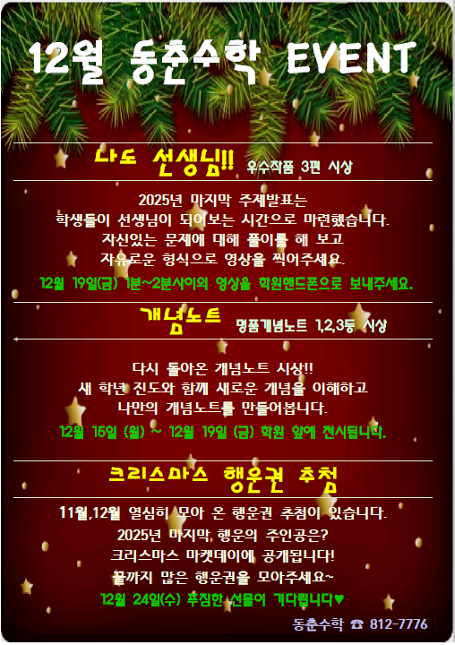 동춘수학 12월 이벤트 동춘동 수학학원 동춘수학은 12월 이벤트 안내입니다. 나도 선생님! 인천 수학학원 동춘수학 학원은 매월 1회 주제발표를 합니다. 매월 셋째주 금요일 그 달 배운 내용을 선정하여 프리젠테이션하는데요. 2025년 결산으로 우수학생을 선정 시상할 예정입니다. 설명을 하려면 이해가 수반되어야 하기 때문에 1달 동안 자주 틀린 문제 위주로 선정하여 발표합니다. 다시한번 풀어보니까 이해가 쏙쏙 되고 설명하려고 하니까 모르는 부분을 선생님께 질문하게 되어서 좋아요. 수학 프리젠테이션의 효과는 시간이 지날수록 수학 자신감을 쌓아가고 있습니다. 개념 노트 컨테스트 수학 공부의 필수템 수학 개념 노트 수학 수업시....... <img src="https://blogthumb.pstatic.net/MjAyNTEyMDhfNjIg/MDAxNzY1MTg1NzMwNzE1.FCiVeLvXQpteLNnPIvp_dZVZGnnM_okz3GN6FsSGWEYg.wywtKy8X2e9eOTzajzUgSk3IjwZi9YCvMPdwr1CHfX8g.PNG/1764939089220.png?type=s3" />
