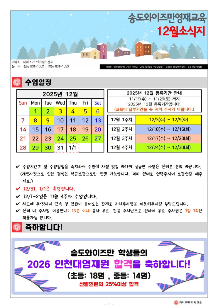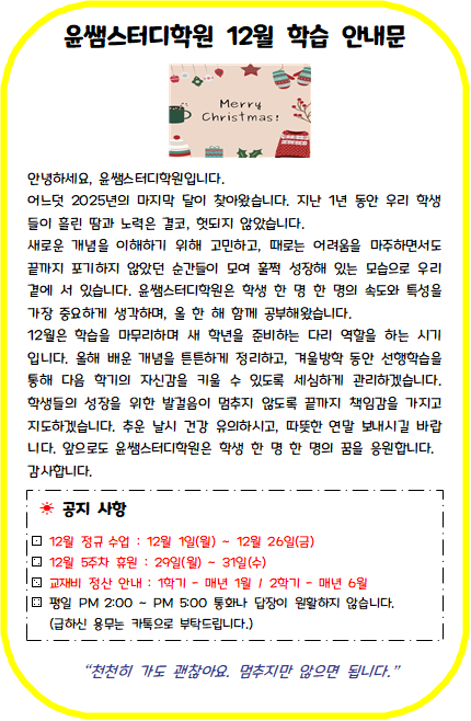 <인천연수동 중등수학학원> 2025년 마지막 달인 12월 학습안내문 입니다.