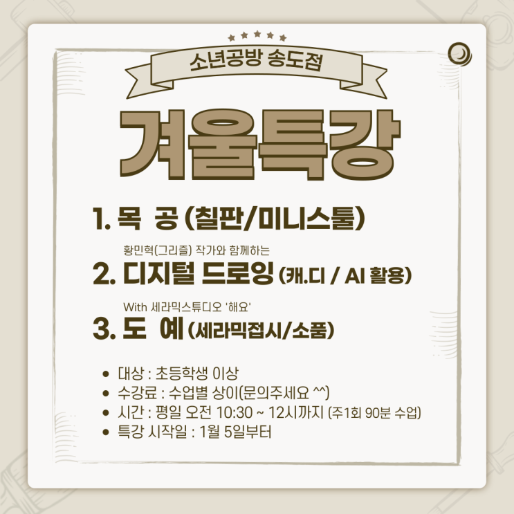 소년공방 송도점 겨울방학 특강 안내 이번 겨울방학, 소년공방 송도점에서 준비한 세 가지 특강이 시작됩니다. 목공, 디지털 드로잉, 도예까지 다양하게 경험할 수 있는 알찬 프로그램으로 구성했습니다. 모든 과정들은 실제 제작 과정 중심의 실습형 수업입니다. 1. 목공 특강 나만의 캐릭터 칠판과 미니스툴 만들기 기초 도구 사용부터 실제 가구 제작까지 경험할 수 있는 과정입니다. 직접 설계하고 조립하는 과정을 통해 창의력과 문제 해결 능력을 함께 키웁니다. 커리큘럼 1주차: 재료 이해, 도구 활용, 캐릭터 선택 2주차: 칠판 제작 및 색칠, 마감 3주차: 미니스툴 설계 및 재단 4주차: 캐릭터 드로잉, 조립, 최종 마감 2. 디지털 드로잉....... <img src="https://blogthumb.pstatic.net/MjAyNTEyMDVfMzAw/MDAxNzY0OTIwNTQ4ODQ2.irBq6wtR7tazodfo6qB86yCyUDoRIRp0kivYnXWVAccg.b3p30Ey2N-2xBtLEeuCJ4YexfrfPkuqA2PFvFKgc-YYg.PNG/001.png?type=s3" />