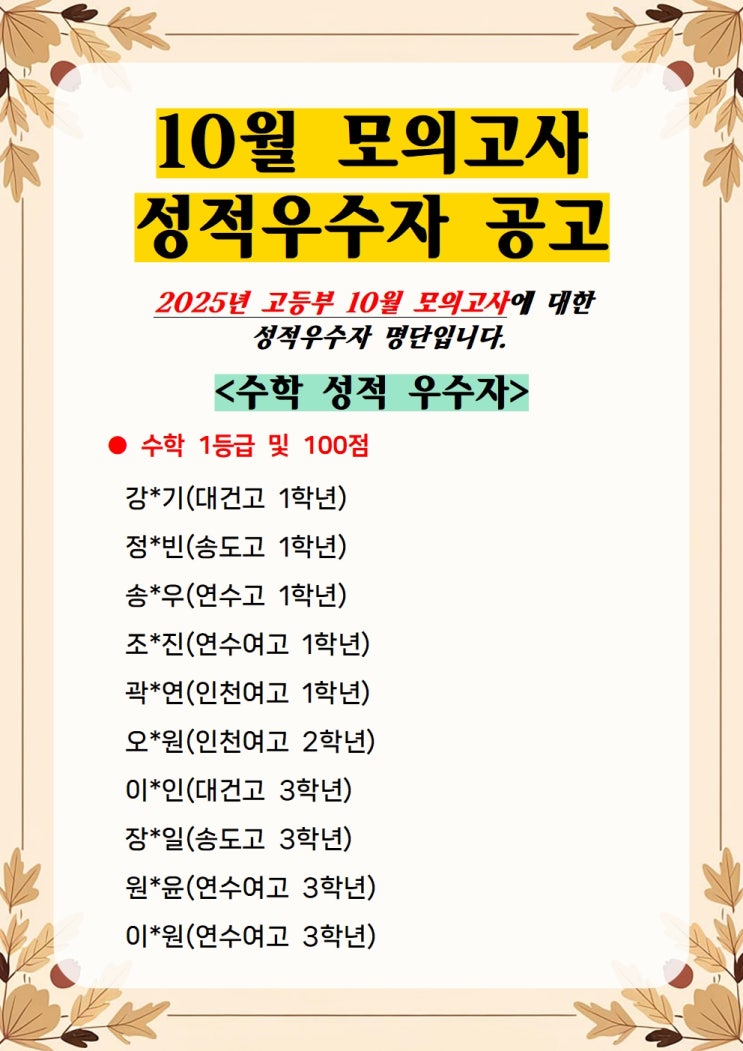 (2025년도 10월 고등부)전국학력평가 성적 우수자.송도 동춘동수학학원 학산학원