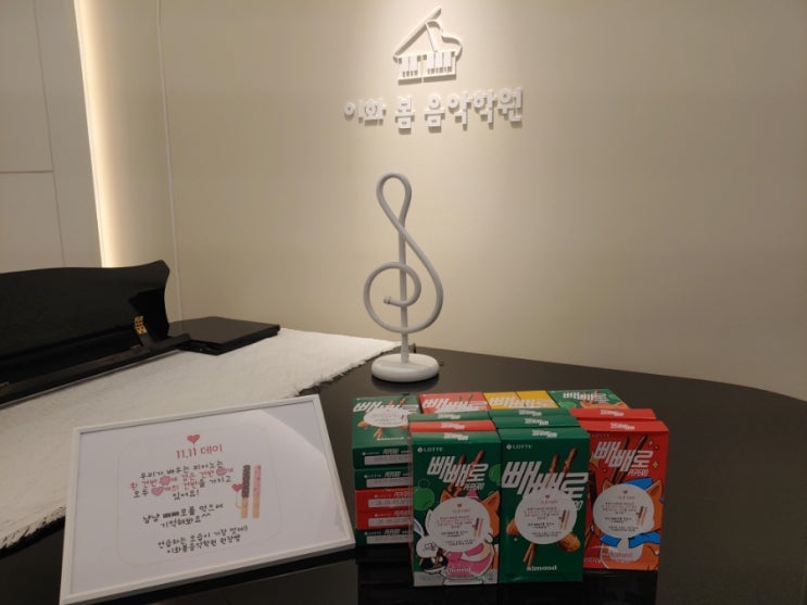 11월도 우리 이화봄친구들의 웃음소리에 선생님은 매일매일 행복한 시간을 보내고 있어요. 음악으로 우리 아이들과 일상을 같이 할수 있다는건 정말 즐겁고 기쁜일이에요~ 11월 빼빼로데이♥ 우리친구들에게 피아노 건반은 몇개일까~~하고 물어봤어요 ㅎㅎ 매일 연습하는 피아노를 보면서 검은건반과 흰건반으로 되어있는건 잘 알고 있지요~ 선생님의 질문에 바로 피아노 건반을 세면서 이야기하는 모습들이 왜 이렇게 귀여운지^^ 가방도 메고 있는채로 하나씩 세어보는 모습이 진짜 너무 귀여워요~^^ 아이들에게 피아노에 대한 상식을 즐겁게 기억하게 해주고 싶었어요^^ 6살친구부터 중등 언니까지~~~ 모두 즐거워하는 모습이었습니다^^ 11월 빼....... <img src="https://blogthumb.pstatic.net/MjAyNTExMjVfOTAg/MDAxNzY0MDM1MTMyODIy.DMNgaOr9nHE0igOQuwpQzVFV2JQruk_f0AVfR3kqeBMg.OcIyYebdoGOw4_sdm5_t-hf_VG1BzwrJqAk9JfI-voEg.JPEG/900%A3%DF20251111%A3%DF133112.jpg?type=s3" />