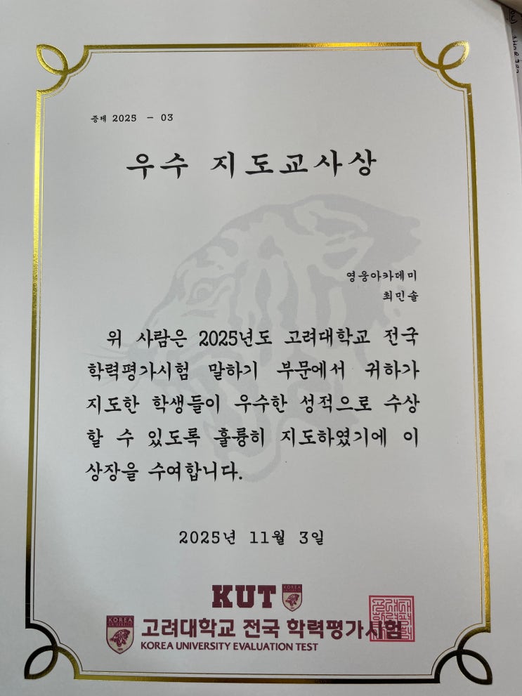 안녕하세요~! 언제나 기쁜 소식을 가져오는 영웅 지킴이입니다^^ 저번에 소개해 드렸던 KUT 고려대 통번역시험 기억나시죠? 전국 1,2등부터 전원이 상 탔던 거 자랑한지 얼마 안 되었는데 우리 초등 저학년부 주니어팀이 이번 KUT 고려대 말하기 대회에서 대상부터 우수상까지(최하 수상이 우수상) 전원 수상하는 쾌거를 이루었습니다~!! 고려대 측에서 전화 왔다는 건 안 비밀 하겠습니다. 어떻게 시험 대비를 시키길래 이렇게 아이들이 성적이 좋은 거냐고.. 당연히 우수지도자 상도 받았습니다~! 전국 KUT고려대말하기대회 영웅주니어가 휩쓸다! 이번 KUT고려대말하기대회에서는 대상 2명!! 최우수상 22명!! 우수상 15명!! 총 39명 학생들이 출....... <img src="https://blogthumb.pstatic.net/MjAyNTExMjZfMTcy/MDAxNzY0MDkwNDQ2MzIz.Mw6JY67yuElNvw5Ydl8G5IqMMGmcfSOnyheUhszIuMAg.XRWpWELkdUXGV0PPTVHqxNHmz87UqwW6rT_mk2atsbcg.JPEG/KakaoTalk_20251126_020349776.jpg?type=s3" />