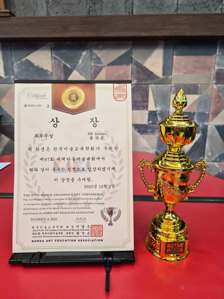 안녕하세요~ 인천 송도 미술, 아트스토리1 미술 학원입니다~ 오늘은 [제97회 세계 아동미술대회] 수상 소식입니다! 이 대회는 학교에서 주관하여 참가한 대회입니다^^ <입상 내역> - 최우수상 1명 세계 아동미술대회의 목적과 취지는 세계 여러 나라의 학생들과 친목을 도모하고, 전시회를 통해 안목을 넓히며 감상할 수 있도록 기회를 제공하여 직, 간접적으로 아이들의 실기능력을 꾸준히 향상시키기 위함이라고 하네요! 우리 아트 스토리 친구의 수상하는 모습과 상장이에요~ 정말 자랑스럽습니다~~ 입상한 친구는 유치부 때부터 초등학교 4학년이 된 지금까지 꾸준히 아트스토리를 다니고 있답니다~~ㅎㅎ 평소에도 수원 화성 그리기 대....... <img src="https://blogthumb.pstatic.net/MjAyNTEyMDRfODkg/MDAxNzY0ODM4MzA4NDA1.hJTG4q4jEH2RVZ8SrJMxCxGFE_fSyB4ZmJS7WZ14DyIg.H-sufOLC4cKgo2FQqnq1b4Y-WZOuM7kSqDJMIqr8cZMg.JPEG/KakaoTalk_20251204_174725301.jpg?type=s3" />