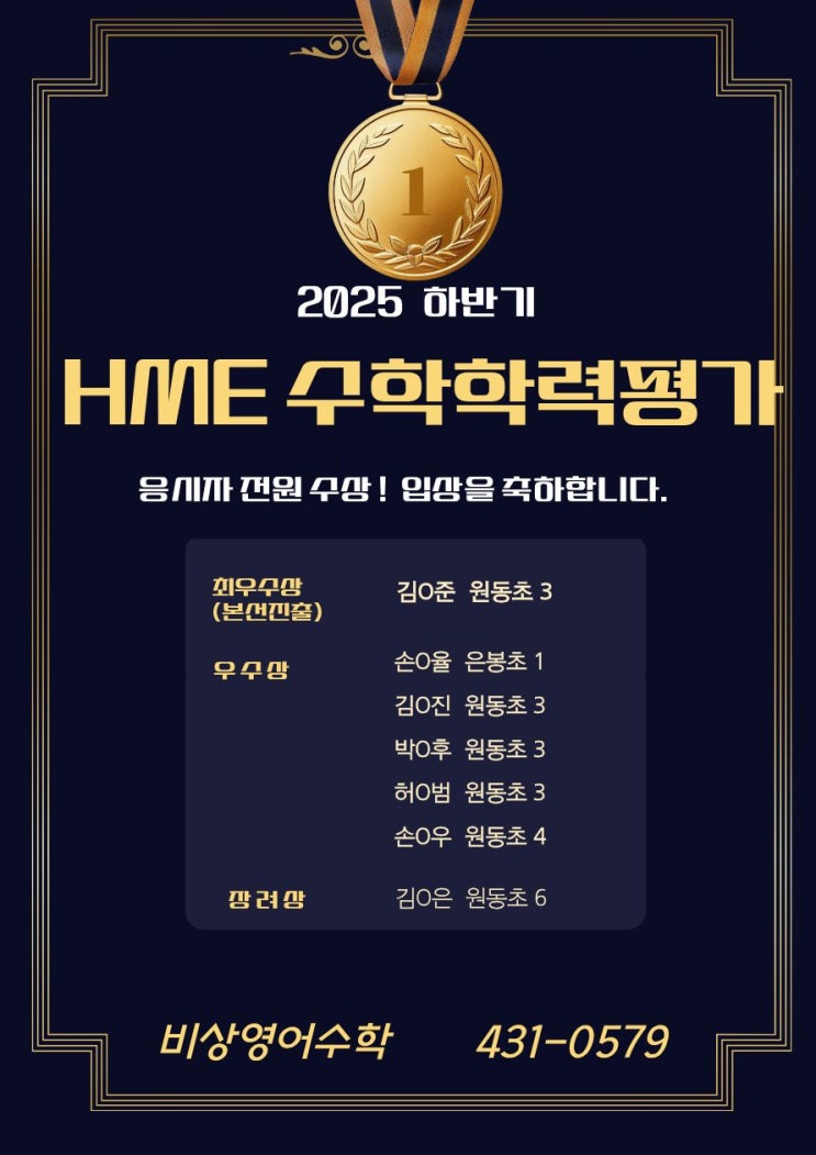 지난 포스팅을 HME 시험 준비 과정을 했습니다. 시험 후 결과 발표까지가 이렇게까지 긴장되고 떨린 시간은 처음인 듯 합니다. 우리 응시한 원생들 긴장할까봐 가채점표도 작성하지 않았던 터라서 본사의 결과 발표만 기다렸습니다. 저의 목표는 전원 수상! 상의 종류는 중요하지 않았습니다. 평상시 준비하던 대로만 하자! 실수하지 많자! 우리 비상 친구들... 대부분 저학년이었음에도 불구하고 준비한 실력발휘 제대로 했습니다. 결과표를 보니 1문제씩만 더 맞췄더라면 상이 한단계씩 레벨업될텐데... 하는 아쉬움도 있었지만, 그런 아쉬움 하나씩은 있어야 다음 시험을 또 준비할 수 있겠지요. 그 동안 준비하느라 고생했습니다. 모두모두 축....... <img src="https://blogthumb.pstatic.net/MjAyNTEyMDFfMjM4/MDAxNzY0NTY3MjI3OTg0.4zWNCqF28hiORkW3LndVvAxnggMTPXHwfQ_cMg9nBrsg.B37TY-3YbrTsbhCNjrQZn1UCmahEotXOnmjuetCmmTgg.JPEG/hme%C0%D4%BB%F3.jpg?type=s3" />