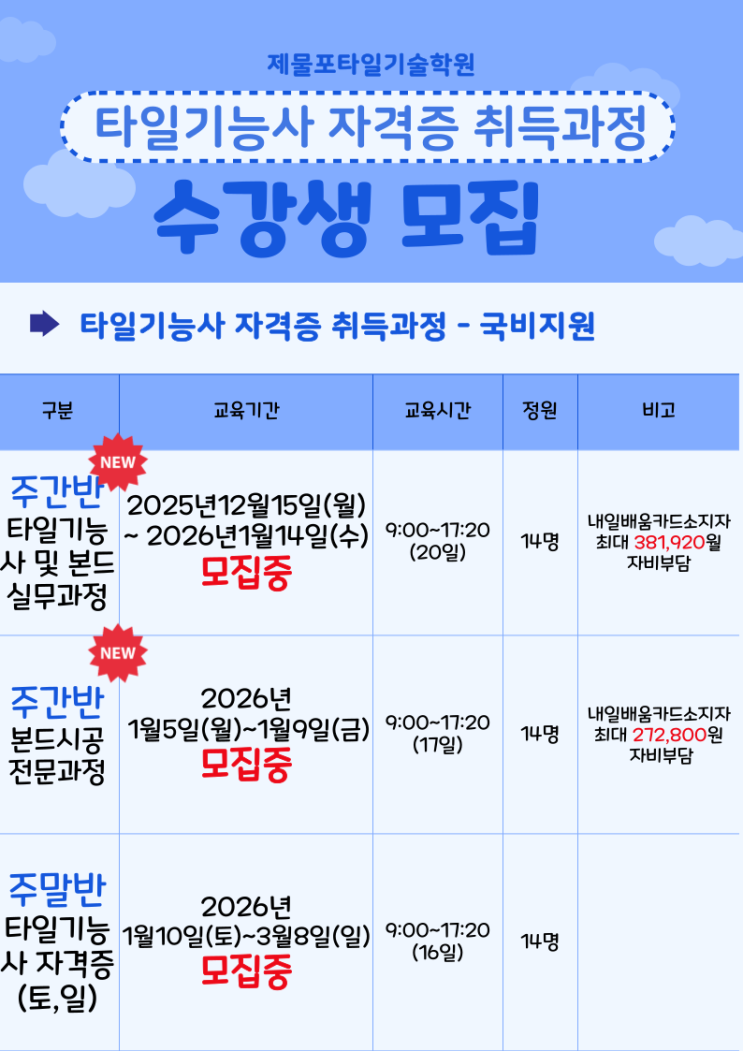 저희 제물포타일기술학원에서는 재직자, 근로자, 실업자, 구직자,내일배움카드 소지자를 위한 "국비지원 자격증 취득과정" 을 아래와 같이 운영하고 있습니다. <img src="https://blogthumb.pstatic.net/MjAyNTExMzBfMTM1/MDAxNzY0NDc5ODYyMDY5.ViaI-HX3E6w4BN6oBtUE2ER6hGEqLYxYvICq7UBOrdog.q3B1Ag1It5Nb_KxXCmsNrQRFWFVPM629womvSnx0Ieog.PNG/%C5%B8%C0%CF%B1%E2%B4%C9%BB%E7-%BC%F6%B0%AD%BB%FD%B8%F0%C1%FD-001_%283%29.png?type=s3" />
