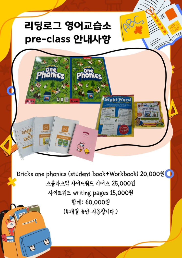 리딩로그 영어교습소 원장 Casey입니다. 리딩로그 정규 클래스 수업에 앞서, 아이들이 보다 안정적으로 영어 읽기를 시작할 수 있도록 Pre 반(파닉스·사이트워드 기초반) 과정을 운영하고 있습니다. Pre 반은 알파벳 소리와 기본 파닉스 규칙 익히기 기초 사이트워드 학습 영어 원서 읽기 수업을 위한 기초 체력 다지기 등을 목표로 하고 있으며, 정규 클래스 진입 전에 꼭 필요한 준비 단계로 구성되어 있습니다. 또한, 수업에서 사용하는 교재는 직접 구매가 원칙임을 안내드립니다. 아이들이 꾸준히 반복하며 학습해야 하는 교재 특성상, 각 가정에서 구비해 주시는 것이 가장 효과적입니다. 날짜가 급하여 준비가 어려우신 학부모님께서는 01....... <img src="https://blogthumb.pstatic.net/MjAyNTEyMDRfMTk3/MDAxNzY0ODIzMjc4Mjcy.xCfW5-D4qcfA4iD8mNAIdcckO2Tc3f5Exnvi2rmj6_4g.QSX-DKxybWWUGIpdVZOFzwRp6b7BrNUqP03v9GLbeQkg.JPEG/IMG%A3%DF5100.JPG?type=s3" />
