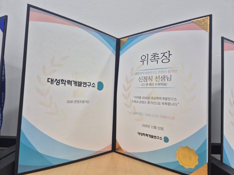 안녕하세요. 디앤제이수학입니다. 디앤제이수학에서 고3 수업을 담당하고 계신 신정식선생님께서 2년연속으로 대성학력개발연구소 콘텐츠 평가단으로 활동하시게 되었습니다! 위촉장이 언제오려나하고 기다리고 있었는데 드디어 받았습니다. 2026년에도 고3 내신대비, 수능대비, 수리논술, 약술논술은 디앤제이수학에서 책임지겠습니다. 등록번호 서부 제 2785호 디앤제이수학학원 중등수학 30만원부터, 고등수학 40만원부터 (과정별, 과목별상이) 서구 이음5로 70 새샘프라자 5층 503호 (검단신도시 금호어울림센트럴정문앞) 상담문의 010-5857-0610 <img src="https://blogthumb.pstatic.net/MjAyNjAyMDZfMTY3/MDAxNzcwMzY0NzA5NTg1.qUyvGwO9wnsfaXm-uBUcL11iJW2dgEmadhoRy1sWtNMg.5cPZOO0nVXz9Ccc6eRHBnw0rxPkFannBIwwZnlmw4Mog.JPEG/KakaoTalk_20260206_165618955_03.jpg?type=s3" />