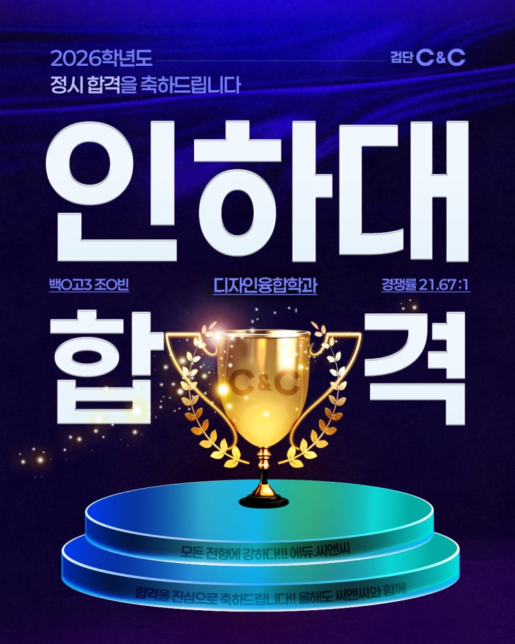 안녕하세요~ 인천 서구 검단신도시 검단미술학원 검단C&C미술학원입니다! 오늘은 2026학년도 인하대 합격 소식을 전하고자 합니다. 인하대 디자인융합학과 경쟁률 21.67:1 정시 합격을 축하합니다!! 2026학년도 인하대 합격생 재현작입니다. 검단C&C 미술학원은 오늘도 달립니다 ! 미대입시는 C&C , 합격은 C&C 2025 제1차 전국 연합 C&C 연구작 품평회 최우수상 서울, 경기권 최다 수상! 검증된 선생님들의 실력✍️ ✔ 중등부터 고등까지 이동 없이 한곳에서! ✔ 각 반 담임제 · 학년별 체계적인 수업 검단 씨앤씨미술학원에서는 예비 미술인들의 관심, 대환영 합니다:) 문의사항 032-563-1586 마전역 2번 출구 맞....... <img src="https://blogthumb.pstatic.net/MjAyNjAyMjZfNDMg/MDAxNzcyMTAyMDk0ODIx.ZJF6nFKPBpjFuE_02lNoZnyJaXSkOpYwAgk3fbt9-5sg.fqpnlYg_QWywV_453Kf_Q1AFxyCjqpdx63m33aWbX04g.JPEG/KakaoTalk_20260202_164603828.jpg?type=s3" />