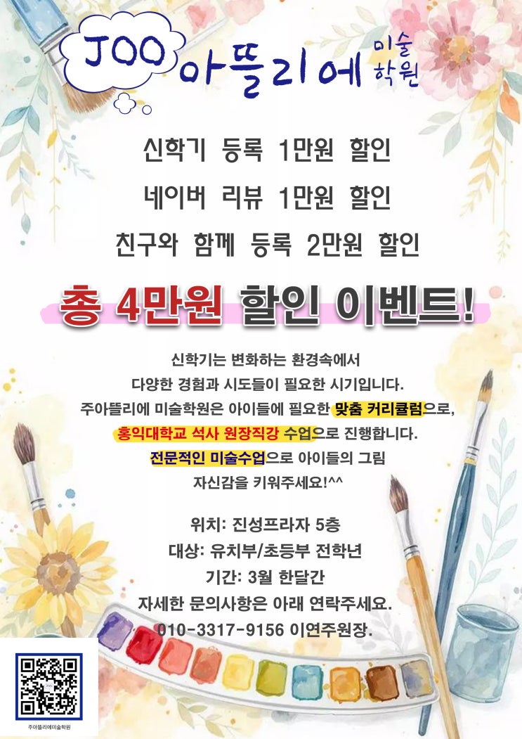 새학기 시작의 봄바람이 솔솔 불어와 새싹들을 맞이하는 3월입니다. 주아뜰리에 미술학원에서 3월 신학기 할인 이벤트를 준비했습니다. 더 많은 친구들이 미술의 세계를 경험하고, 도전해볼수 있도록, 새학기 학교 적응에 어려움이 없도록, 주아뜰리에 미술학원은 다양한 수업과 아이들 개별 맞춤수업으로 전문적인 미술수업이 준비되었습니다. 홍익대학교 석사 원장 직강으로 수업하여, 아이들의 필요한 수업이 좀더 직접적으로 들어갑니다. 자세한 문의 사항은 위 내용을 확인하시고 연락주세요!^^ #청라미술학원 #청라미술 #주아뜰리에미술학원 #초등부미술수업 #유치부미술수업 #청라아동미술 #청라미술학원 #아동미술 #미술학원 #아동미술학....... <img src="https://blogthumb.pstatic.net/MjAyNjAyMjdfMjM2/MDAxNzcyMTg1Mjk5ODA4.wEs5E-NfxG4FPSPyOFXzW3XUTE81VMZd0uHaQwyc6NYg.hl88-frwsZ9Jvnpbaw6ZvdEi-bp_027YROEr2671W6Ug.JPEG/%BD%C5%C7%D0%B1%E2%C7%D2%C0%CE.jpg?type=s3" />