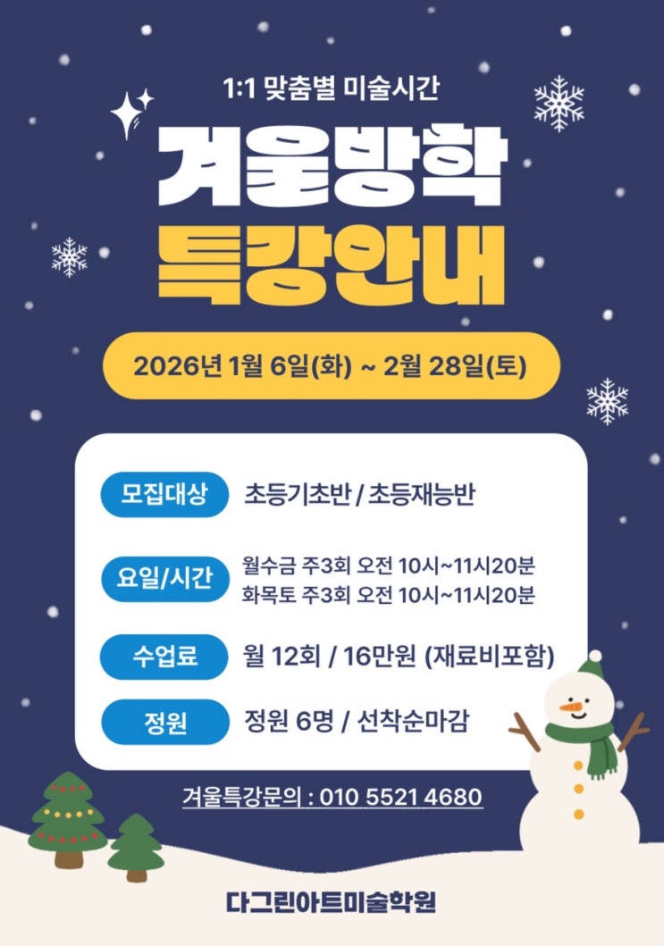 다그린아트미술학원입니다 새해 복 많이 받으세요! 문의는 24시간 대기입니다 시간: 오전10시- 11시20분 주3회 월수금 화목토 정원제 곧 마감 됩니다. 현재 화목토 5명 월수금 곧 마감!! 1:1 맞춤별 수업지도로 인해, 커리큘럼보다는 아이와 생각표현을 미술로 표현하는 시간이 됩니다. 매 주, 이미지 수업 모습들 보내드리며 매 일, 완성 된 작품(그림)을 포장해 집으로 보내드립니다. 카드결제 핸드폰 발송 가능 온누리 결제 가능 계좌이체(현금영수증) 가능 한번도 없었던 1:1 맞춤미술 학원 다그린에서 체험하세요! <img src="https://blogthumb.pstatic.net/MjAyNjAxMDhfMjE4/MDAxNzY3ODU1MDM4NDc3.SOjYqkRMky7jirtTEbqQR8v2dEMjprZ2K78gXUVDEs8g.bckJ9O6C5FfppyraSXlz4frg1gFM99tCDAz4bteIivsg.JPEG/IMG%A3%DF9162.jpg?type=s3" />