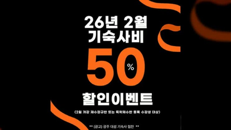 광주 기숙 광주대성학원 대성 기숙사에서 2월에 개강하는 재수정규반 또는 독학재수반 등록 수강생들을 위해 2월 기숙사비 50% 할인 이벤트를 진행하고 있어, 이번 포스트에서는 이와 관련해서 안내를 드리도록 할게요...^^ 광주 기숙 광주대성학원 대성 기숙사 2월 기숙사비 50% 할인 이벤트 01. 대상자 : 2026년 2월 중 개강하는 재수정규반 또는 독학재수반 등록 수강생 02. 혜택 내용 : 2월(첫 달) 기숙사비 50% 할인 03. 적용 방식 : 2026년 2월 8일 일요일까지 아래 본원 홈페이지를 통해 접수를 완료한 수강생에 한정 04. 유의사항 이번 광주 기숙 광주대성학원 대성 기숙사 2월 기숙사비 반값 할인 이벤트는 3개월 이상 수강 유지 시 적....... <img src="https://phinf.pstatic.net/image.nmv/blog_2026_01_27_2969/srRnkMwEuS_01.jpg?type=f480x480" />