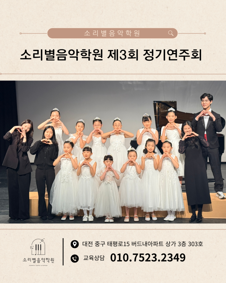 안녕하세요, 소리별 원장쌤입니다^^ 지난 2월07일 토요일은 우리 소리별 친구들이 그동안 정성껏 갈고닦은 실력을 뽐내는 정기연주회가 있었습니다. 관저문예회관에 도착하니 생각보다 더 넓었는지 원장쌤!! 너무 넓어요~~!! 넓어서 떨려요~~ 라고 아우성이었답니다. ㅎㅎ 연습실에서 고군분투 하며 한음 한음 익히던 아이들이 커다란 무대 위에서 당당히 연주하는 모습을 보니 원장쌤으로서 마음이 참 뭉클하고 대견했던 하루였어요. 집중해서 건반을 누르는 아이들의 손가락 하나하나에 진심이 담겨있었습니다. 악보를 통째로 외우고, 어려운 구간을 수백번, 다같이 모여 리허설 하던 무대연습들 그렇게 포기하지 않았던 그 시간들이 모여 오늘....... <img src="https://blogthumb.pstatic.net/MjAyNjAyMjVfMzMg/MDAxNzcyMDMxNDE2MDMw.rjWuADnSSd8Wc8fkb7o_NWu8MY99AtU7uPt6XZ3w2j4g.G1D3Fo7MafYfGcB0tmGYXlnV4uGj9jqJk6pofNU0DHYg.PNG/%BA%A3%C0%CC%C1%F6%BB%F6_%B0%A5%BB%F6_%BD%C9%C7%C3%C7%D1_%B0%ED%BE%E7%C0%CC_%BB%E7%B7%E1_%C3%DF%C3%B5_%C0%CE%BD%BA%C5%B8%B1%D7%B7%A5_%C6%F7%BD%BA%C6%AE__%28%C0%CE%BD%BA%C5%B8%B1%D7%B7%A5_%B0%D4%BD%C3%B9%B0%2845%29%29_%281%29.png?type=s3" />
