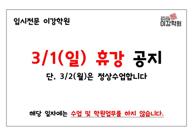 [수원입시전문] 이강학원 삼일절 휴강안내
