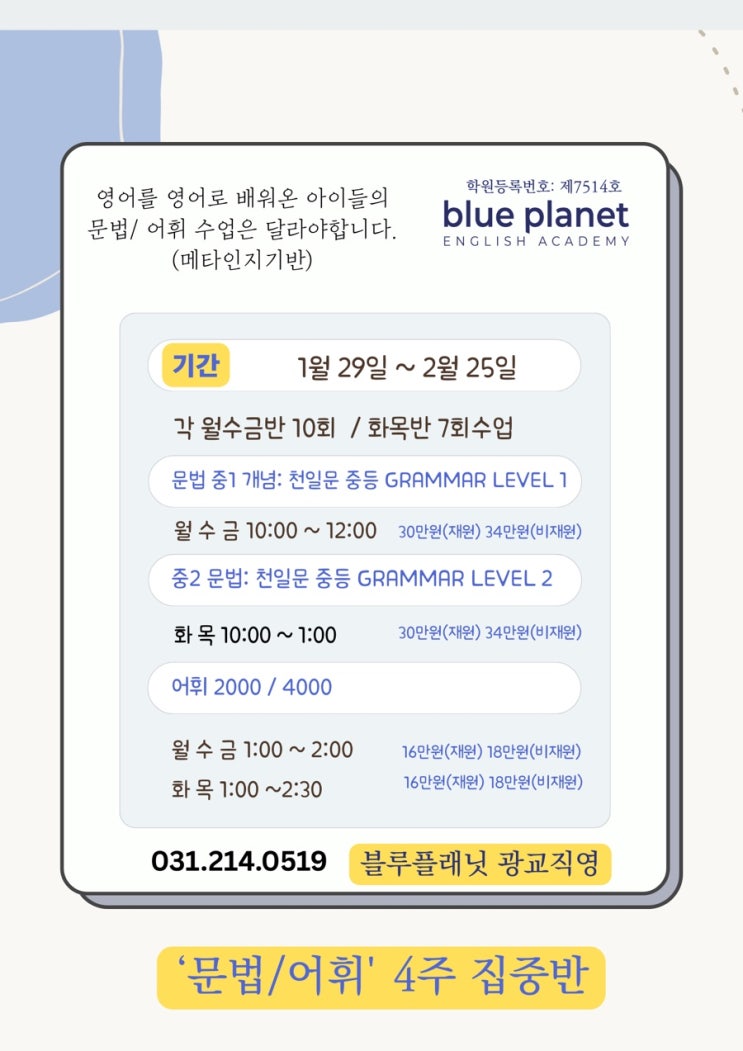 문법·어휘 4주 집중반 영어를 영어로 배워온 아이들, 이제는 문법과 어휘도 다르게 접근해야 합니다. 블루플래닛의 문법·어휘 집중반은 암기 위주의 수업이 아니라 아이 스스로 “왜 이 문장이 이렇게 쓰였는지”를 이해하도록 돕는 메타인지 기반 수업입니다. ✔ 영어 원서 읽기 경험이 있는 아이 ✔ 감으로는 읽지만 설명이 어려운 아이 ✔ 중등 문법으로 자연스럽게 넘어가야 하는 아이에게 특히 효과적인 과정입니다. 수업 특징 요약 영어를 번역하지 않고 구조로 이해하는 문법 수업 초·중등 문법을 읽기 경험과 연결하는 개념 정리 2000 / 4000 어휘를 문장·맥락 중심으로 확장 단기간 주입이 아닌, 이후 독해·쓰기까지 이어지는....... <img src="https://blogthumb.pstatic.net/MjAyNjAxMTZfMTky/MDAxNzY4NDk0NTQzOTIz.7bEXLkRbCUvBcz81c26kvyHNYk4FJgNrflFZIi4fpAgg.829O-8CU0HONEhHZopLNag_iiXnYPgQyDan5utc5aVEg.JPEG/IMG%A3%DF4971.jpg?type=s3" />