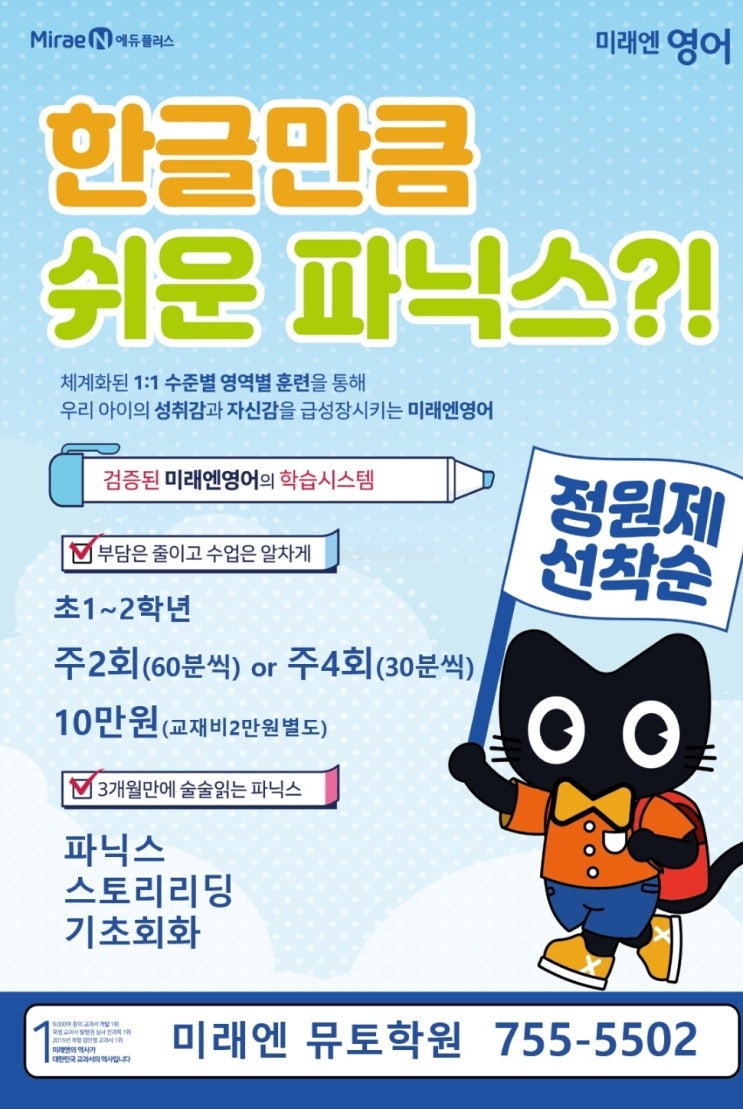 우리 아이 첫 영어공부, 어떻게 시작해야 할 지 고민되시죠? 어느 덧 3월 4주차에 접어들었습니다. 엊그제 1학년 입학 또는 2학년에 올라간거 같은데 이렇게 시간이 금방 지나갔습니다. 저희 미래엔영어 뮤토학원에서는 초등 저학년 친구들을 위한 파닉스수업을 진행하고 있습니다. 1대1 개인별 맞춤수업으로 영어의 기본기를 탄탄하게 다지겠습니다 요즘 초등학교 1~2학년 친구들은 학교생활 적응하느라 가장 힘든시기이고 또한 가장 바쁜 시기이기도 합니다. 그래서 저희 학원은 부담은 줄이고 수업은 알차게 주2회(60분씩)반 또는 주4회(30분씩)반으로 수강료 10만원에 운영합니다 파닉스가 중요한 이유 영어를 처음 배우는 아이들에게 가장 중....... <img src="https://blogthumb.pstatic.net/MjAyNjAzMjNfMTAy/MDAxNzc0MjI2MjQ3NzI0.jPnbVUWLGR1WwVXfD5pu2NJWq0uBvRPyMqLa8nCchoUg.H995SOQOvYNvqpDw9vXxggkVjmwNdnrwg-F8E61dWC0g.JPEG/%C6%C4%B4%D0%BD%BA%B1%A4%B0%ED%BC%F6%C1%A4.jpg?type=s3" />