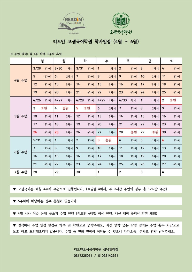 2026 리드인 오샘국어학원 위례점 학사일정(4월~6월)