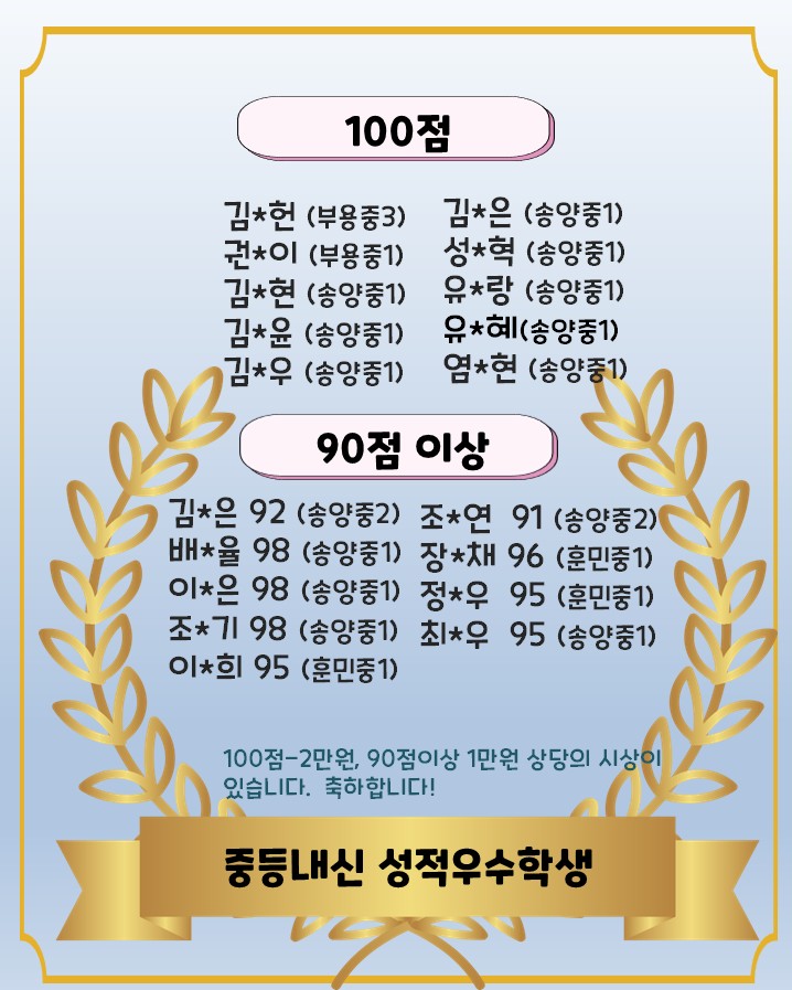 기말고사 성적우수 학생들을 축하합니다 안녕하세요. 민락동 삼성영어 셀레나 지사직영학원, 삼현학원입니다. 이번 기말고사를 통해 삼현학원 중등 학생들 중 100점·90점 이상 성적을 거둔 학생들이 다수 배출되었습니다. 진심으로 축하합니다 결과보다 더 값진 것은 ‘과정’입니다 시험 점수는 결과이지만, 그 점수 뒤에는 ✔ 매일 빠지지 않고 이어진 수업 참여 ✔ 듣기·쓰기·말하기·문법·어휘를 고르게 쌓아온 학습 ✔ 포기하지 않고 끝까지 해내려는 태도 가 차곡차곡 쌓여 있습니다. 특히 이번 시험에서는 단기간 벼락치기보다 평소 학습 습관과 수업 참여도가 그대로 결과로 이어진 학생들이 많아 더 의미 있는 성과라....... <img src="https://blogthumb.pstatic.net/MjAyNjAxMDZfMTAy/MDAxNzY3NzEwNjYxOTgz.ouSu1tiC1G3--njETlALiUyo3KBaiYt0Kk4mp3hJ4wIg.OzwfLhnKQSVTwoKsfHOIuy7qZSZ-QQJL-1FchxOUj0og.JPEG/%BC%BA%C0%FB%BF%EC%BC%F6.jpg?type=s3" />