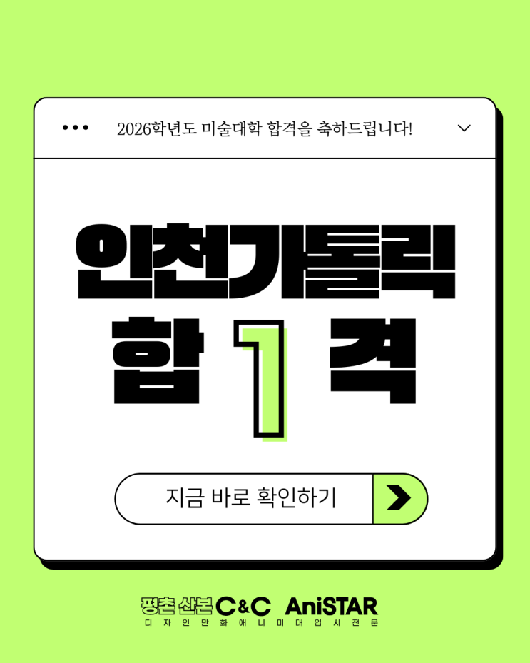 안녕하세요 평촌에서 디자인 애니 잘하는 입시미술학원 평촌씨앤씨애니스타 미술학원입니다. [ 인천가톨릭대학교 합격] [아래 사진을 눌러 상담예약하기] [26학년도 총 합격자] 평촌 씨앤씨 • 애니스타는 무엇이 다른가요? 실기에서 무엇보다 중요한 것은 바로 검증된 실기력과 탄탄한 커리큘럼! 개개인의 맞는 맞춤수업과 피드백이 항상 준비된 학원 학무보님들께서 우리 아이들을 안심하고 보내실 수 있는 환경제공이야 말로 최고의 서비스라 자부합니다. "노력은 날 배신하지 않습니다." 꾸준히 연습하는 만큼 증명되는 나의 실기력 출석이 곧 실기력으로 이어지는 길 입니다. 계속되는 입시, 긴장되고 불안한 심리에 우리 아이들....... <img src="https://blogthumb.pstatic.net/MjAyNjAzMTNfODAg/MDAxNzczMzc3MTc3ODc2.Kgqr7dIVHU684crgpOSeVfUZlGiF4ZeB-u4M-kbmQPEg.PiipMemydu3Tt2kVqr0quRAXteetwy9xYdXDSpBuCGog.PNG/1.png?type=s3" />