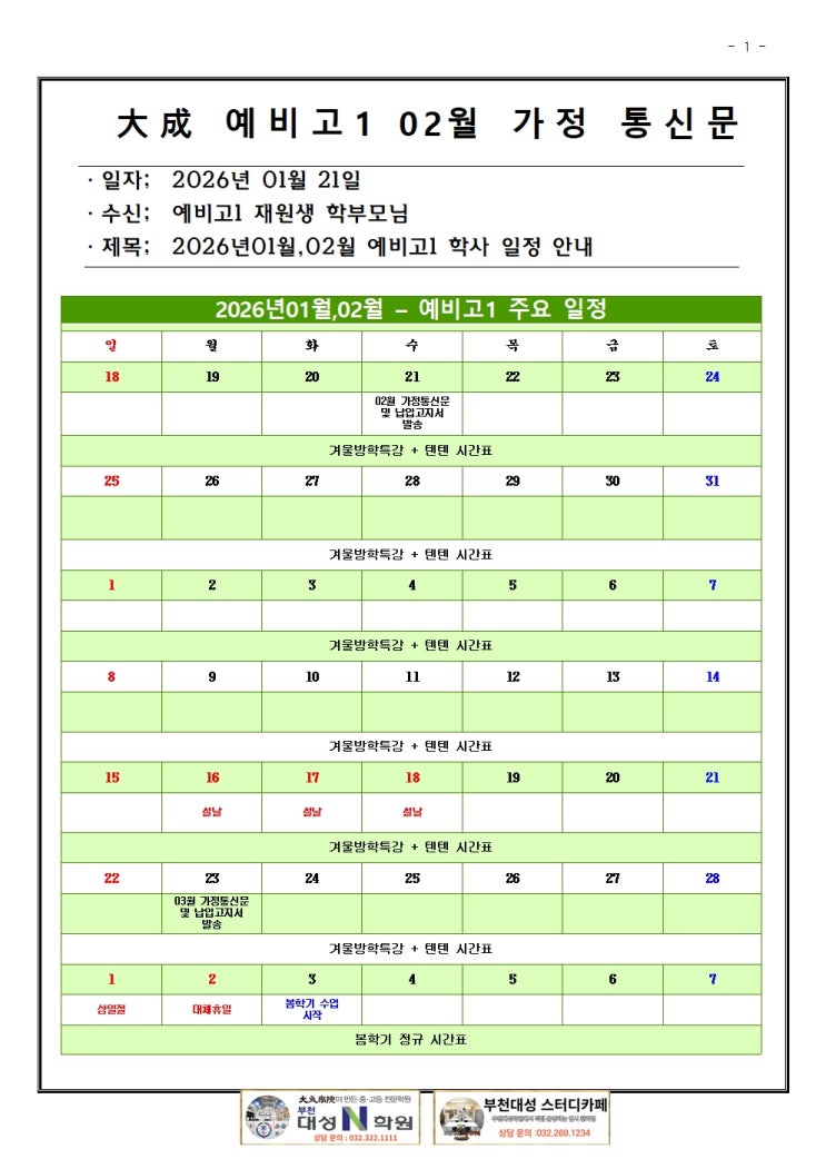 안녕하세요, 부천대성학원입니다. 이제 고등학교 입학이 한 달 앞으로 다가왔습니다. 2월은 중학교의 습관을 벗어던지고 고등학생의 자세를 완성해야 하는 **'골든타임'**입니다. 부천대성학원이 준비한 2월 윈터스쿨과 텐텐자습으로 완벽한 입학 준비를 시작하세요. 1. 2월 주요 학사 일정 (꼭 체크하세요!) 설 명절 연휴와 새 학기 시작일을 미리 확인하시어 학습 흐름이 끊기지 않도록 관리해 주시기 바랍니다. 1월 21일(수): 2월 가정통신문 및 납입고지서 발송 완료 2월 16일(월) ~ 18일(수): 설날 연휴 휴무 2월 23일(월): 3월 가정통신문 및 납입고지서 발송 3월 2일(월): 대체 휴일 휴무 3월 3일(화): 봄학기 정규 수업 시....... <img src="https://blogthumb.pstatic.net/MjAyNjAxMjFfMTk5/MDAxNzY4OTYwNTgyMTcw.XdBmuBfwdan-soRERk-Tem9_dLnpnodp5rb8y8kFe24g.9W4z8qaNpu41qsPYvqsAnlz0KkUfIaFK_C0ec9X9gzog.JPEG/2026%B3%E202%BF%F9_%B0%A1%C1%A4%C5%EB%BD%C5%B9%AE%BF%B9%BA%F1%B0%ED1001.jpg?type=s3" />
