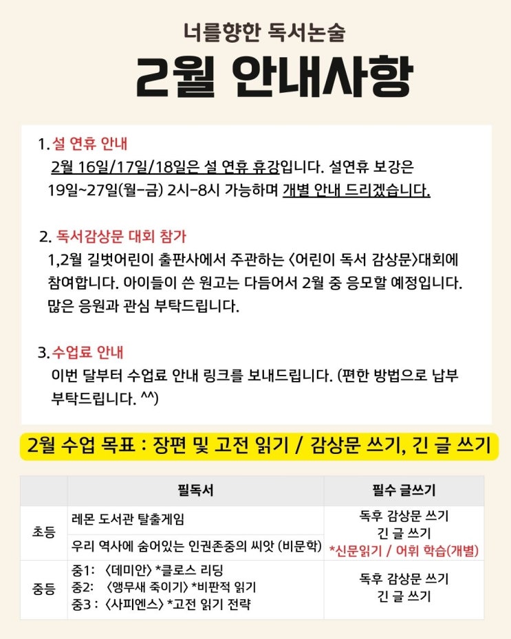안녕하세요. 2월 수업 안내드립니다. 2월에는 아이들과 ✅두꺼운 책 읽기와 ✅긴 글 쓰기, ✅독후감상문 쓰기(대회 참가)를 통해 한 단계 더 성장하는 시간을 보낼 예정입니다. 아이들이 끝까지 해낼 수 있도록 따뜻한 응원과 격려 부탁드립니다. 감사합니다. <img src="https://blogthumb.pstatic.net/MjAyNjAxMjZfMjc5/MDAxNzY5NDIxMDUzOTQx.ejP2YgP3XAv5aWB2EqNqvCmDJ90UvT0lvYG3HiegKPIg.65W3ZUeEN1BWQI_b5xf7jnANi4YvI6CpQcAZK7uF0Esg.JPEG/2%BF%F9%B0%F8%C1%F6%28%BC%F6%C1%A4%29.jpg?type=s3" />